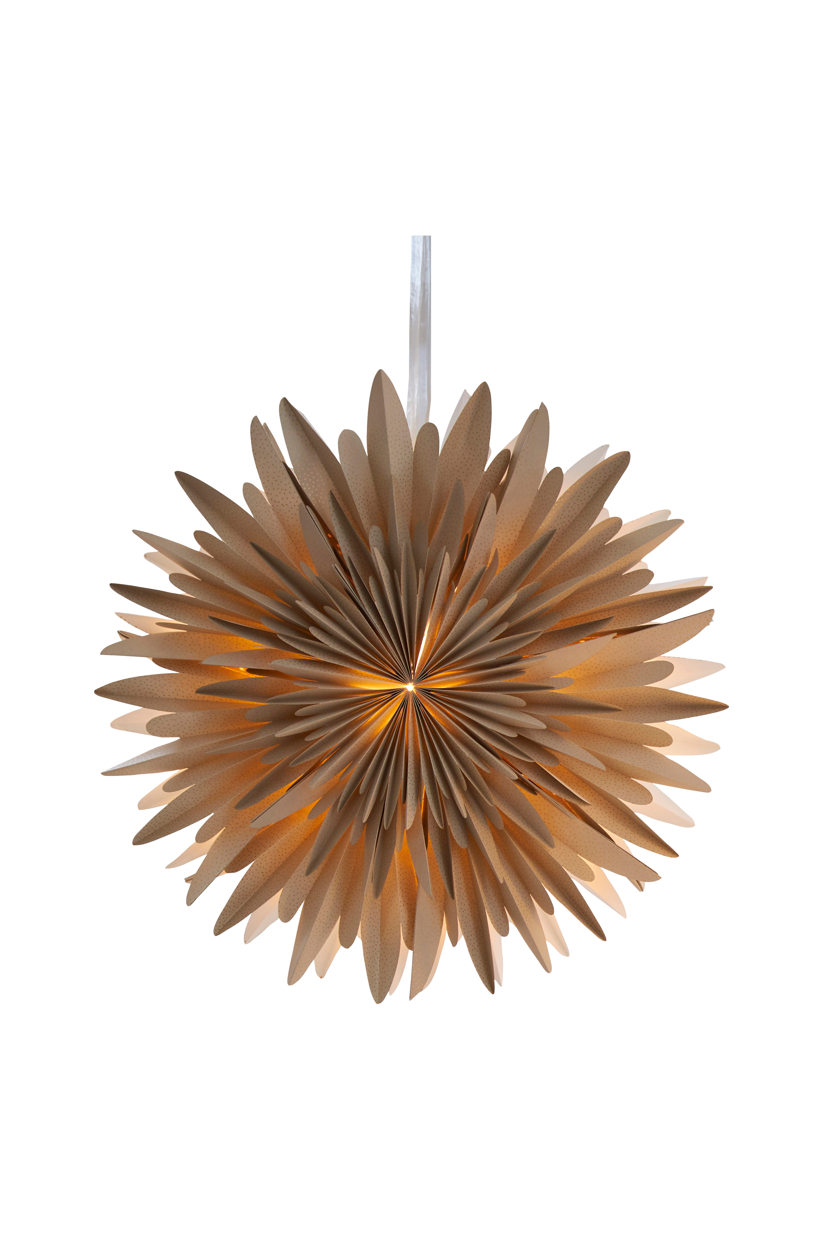 Kolmesta laskostetusta paperikerroksesta valmistettu paperitähti. Kontuurissa on pyöreät reunat, jotka tekevät tähdestä ilkikurisen talvisen näköisen. Mukana on tyylikäs nauha, joka helpottaa tähden ripustamista. Adventtitähti luo täydellisen joulutunnelman ja antaa kotiin erityisen jouluisen tunnelman. Voidaan ripustaa sekä ikkunaan että seinää vasten. Lisää johtosarja ja valonlähde tähden valaistusta varten.