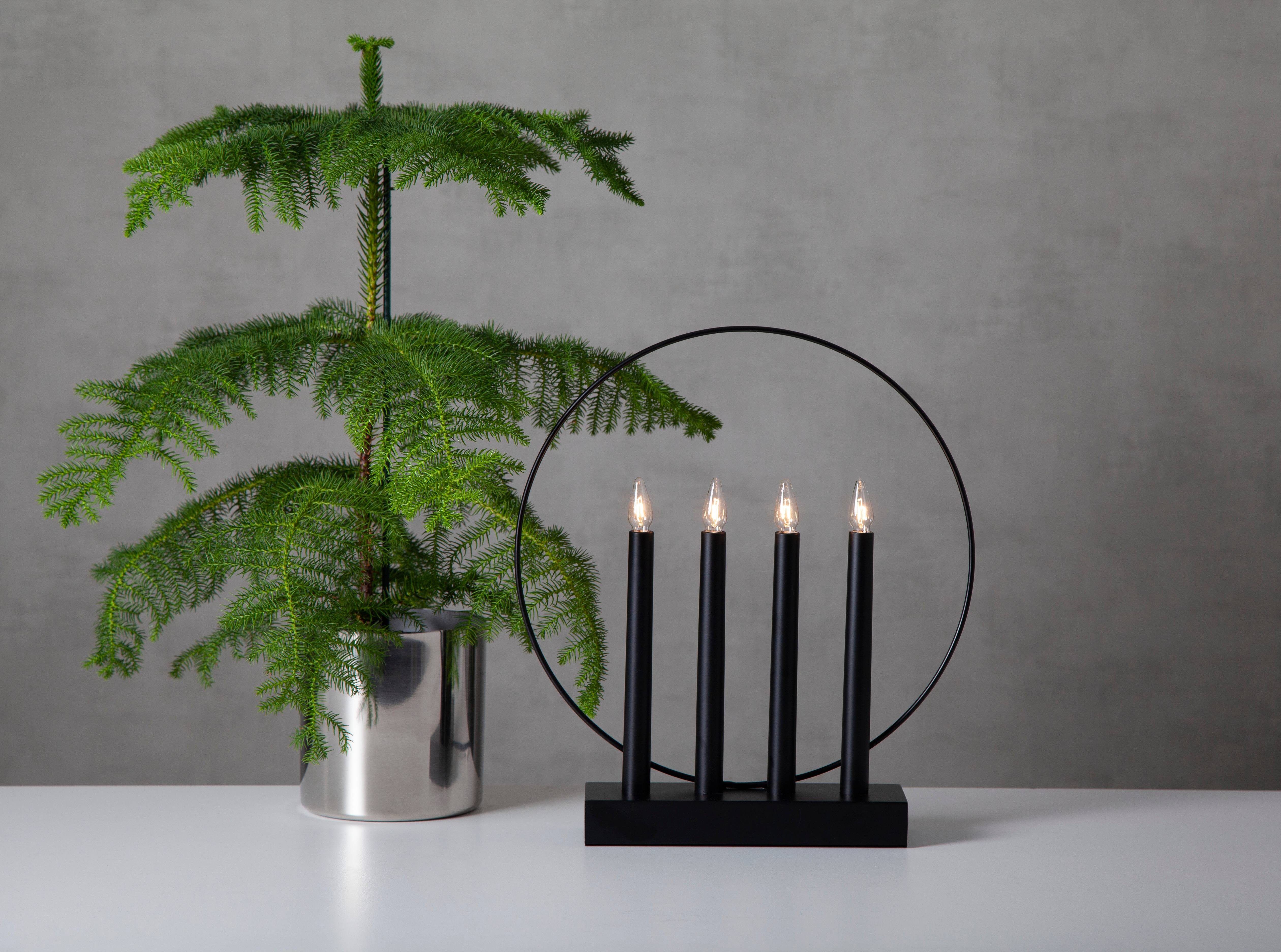 Edullinen, tyylikäs sähkökynttelikkö, jossa on musta puukehys ja musta koristerengas metallia. 4 valoa, jotka luovat kodikkaan tunnelman ikkunalle tai pöydälle. Korkeus 35 cm, leveys 32 cm. Musta liitäntäjohto 180 cm. Virtakytkin.