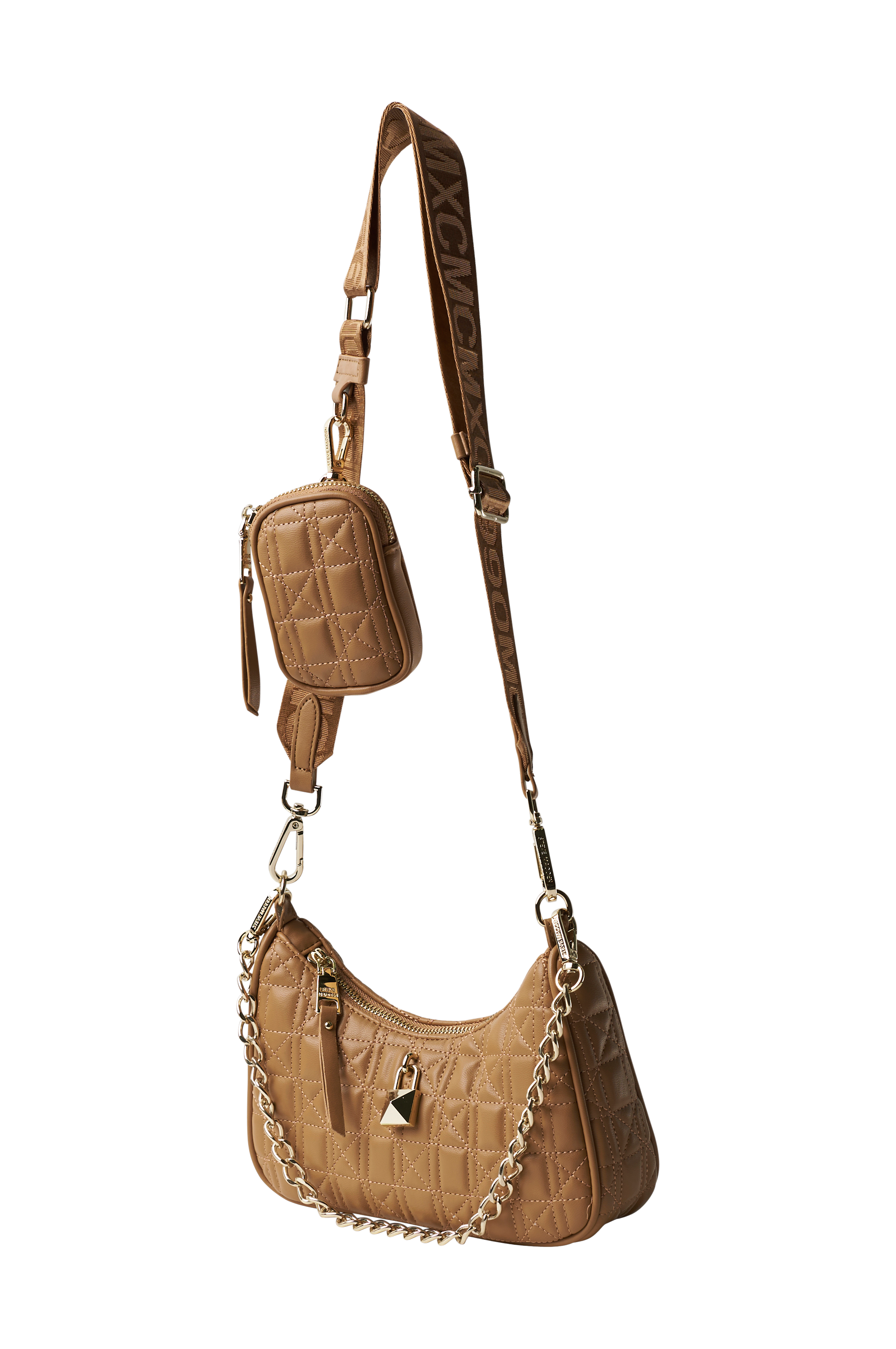Tikattu laukku nahkajäljitelmää. Sisäpuolella kangasvuori ja yksi lokero. Lyhyt, irrotettava ketju ja pitkä irrotettava olkahihna, jossa logo. Irrotettava kukkaro. Mitat n. L24 x K15 x S6.