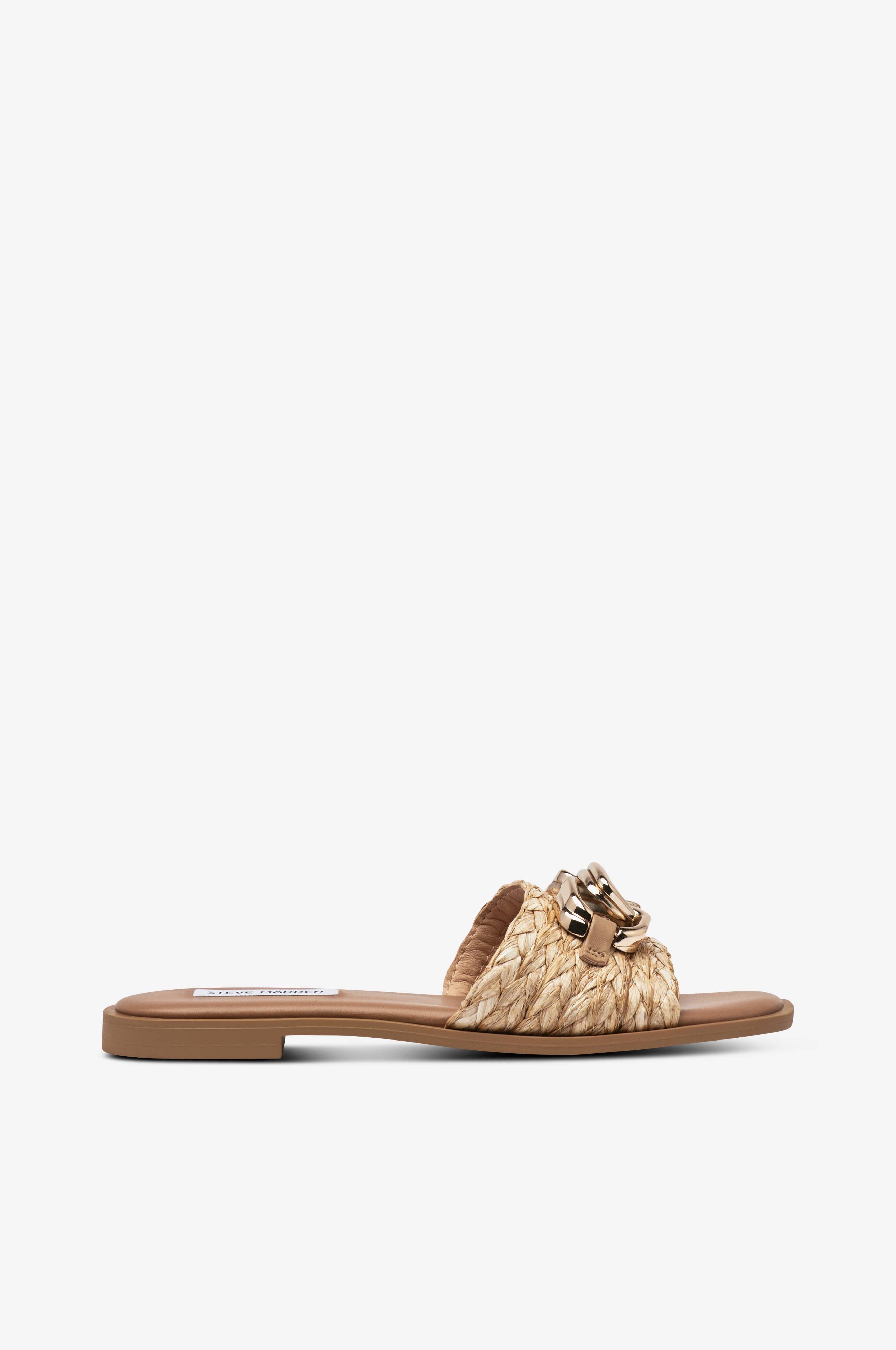 • Leveä hihna raffiasta koristeellisella soljella edessä• Pohjallinen keinonahasta