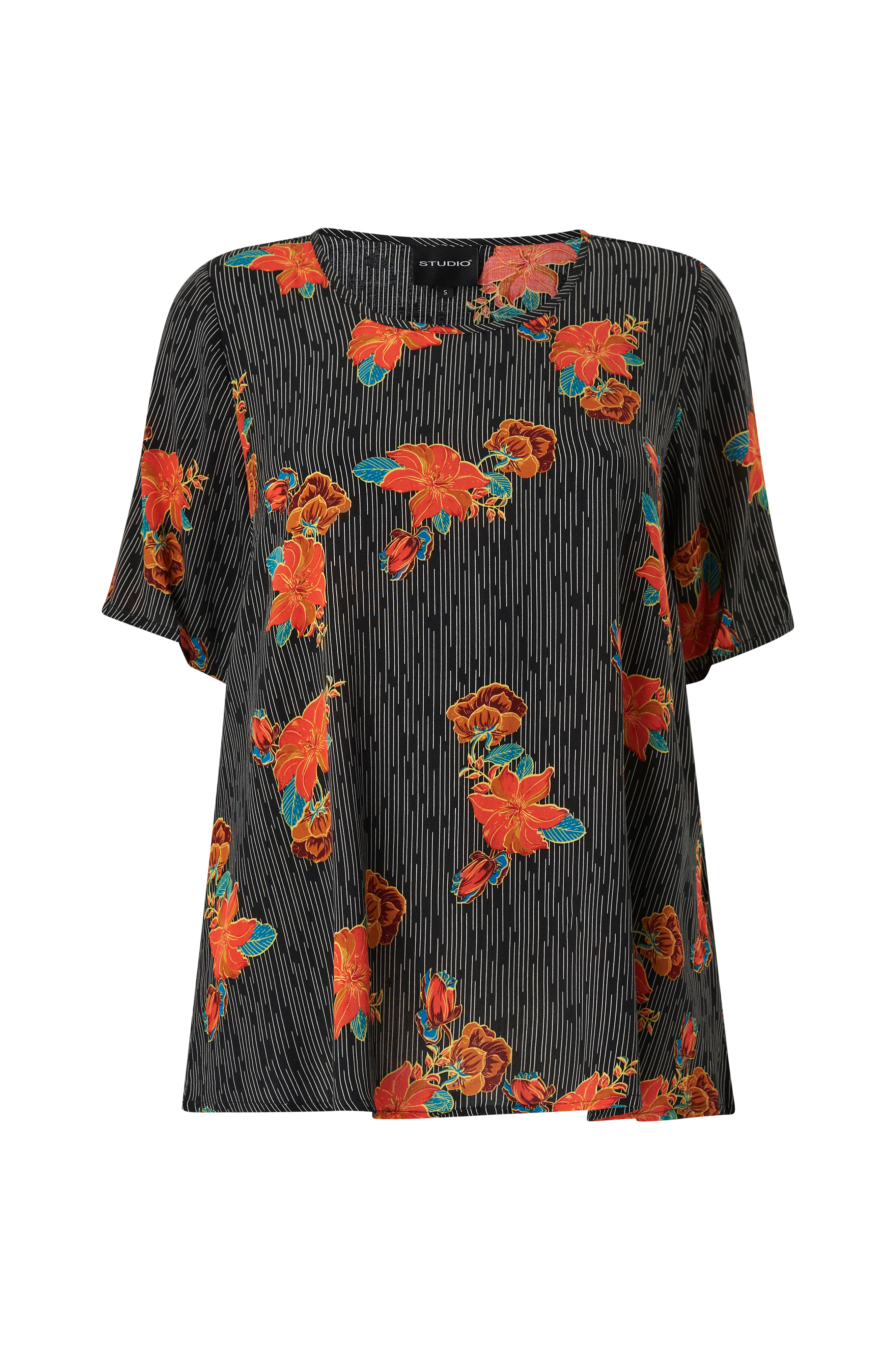 • Kuvioitu pusero viskoosista• Veneen muotoinen kaula-aukko• Lyhyt hiha• Plus-koot