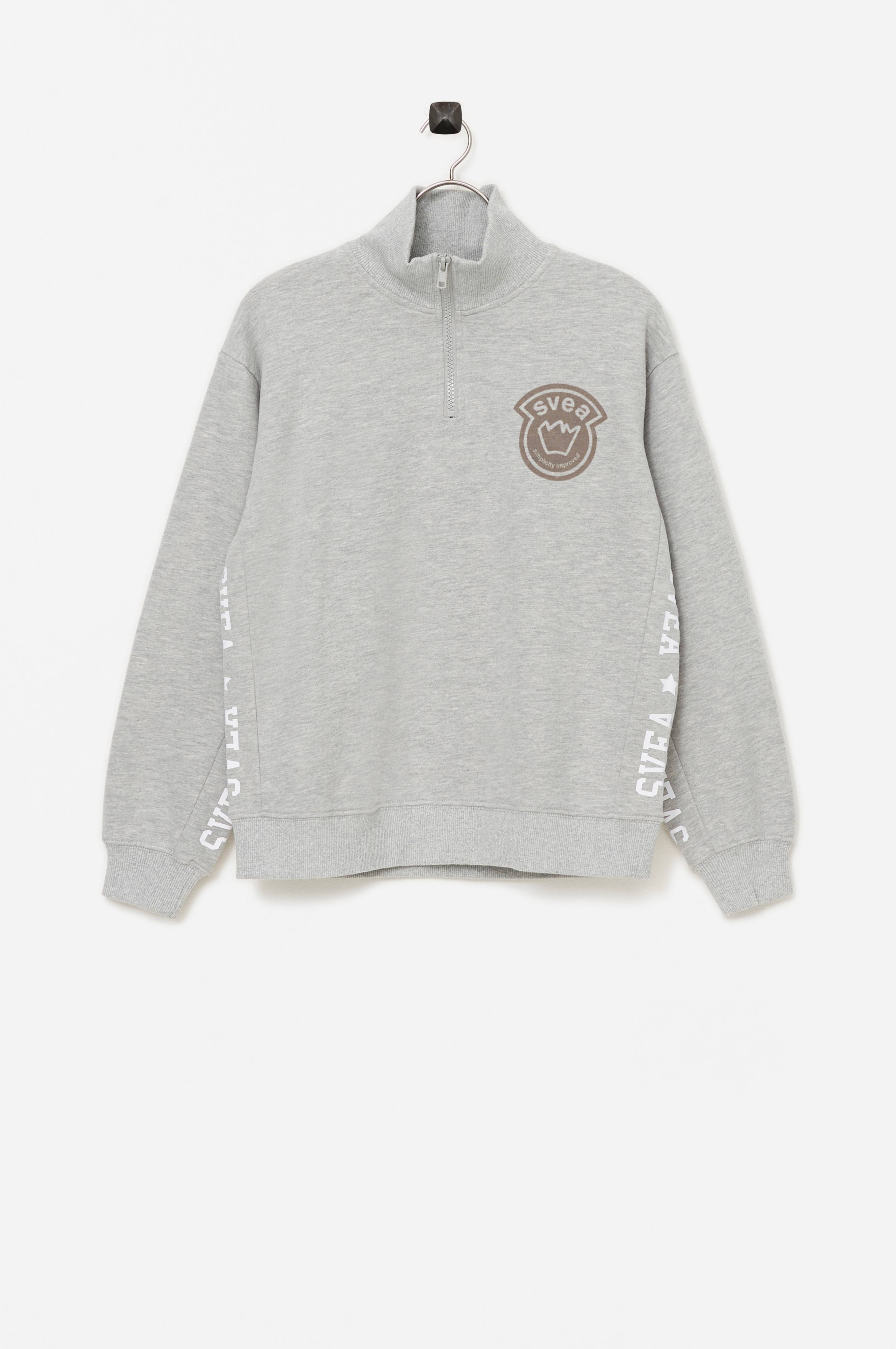 Collegepusero, jossa painatus hihoissa ja sivuilla. Joustinneuloskaulus ja lyhyt vetoketju. Painettu samettilogo rinnassa. Resori hihansuissa ja helmassa.