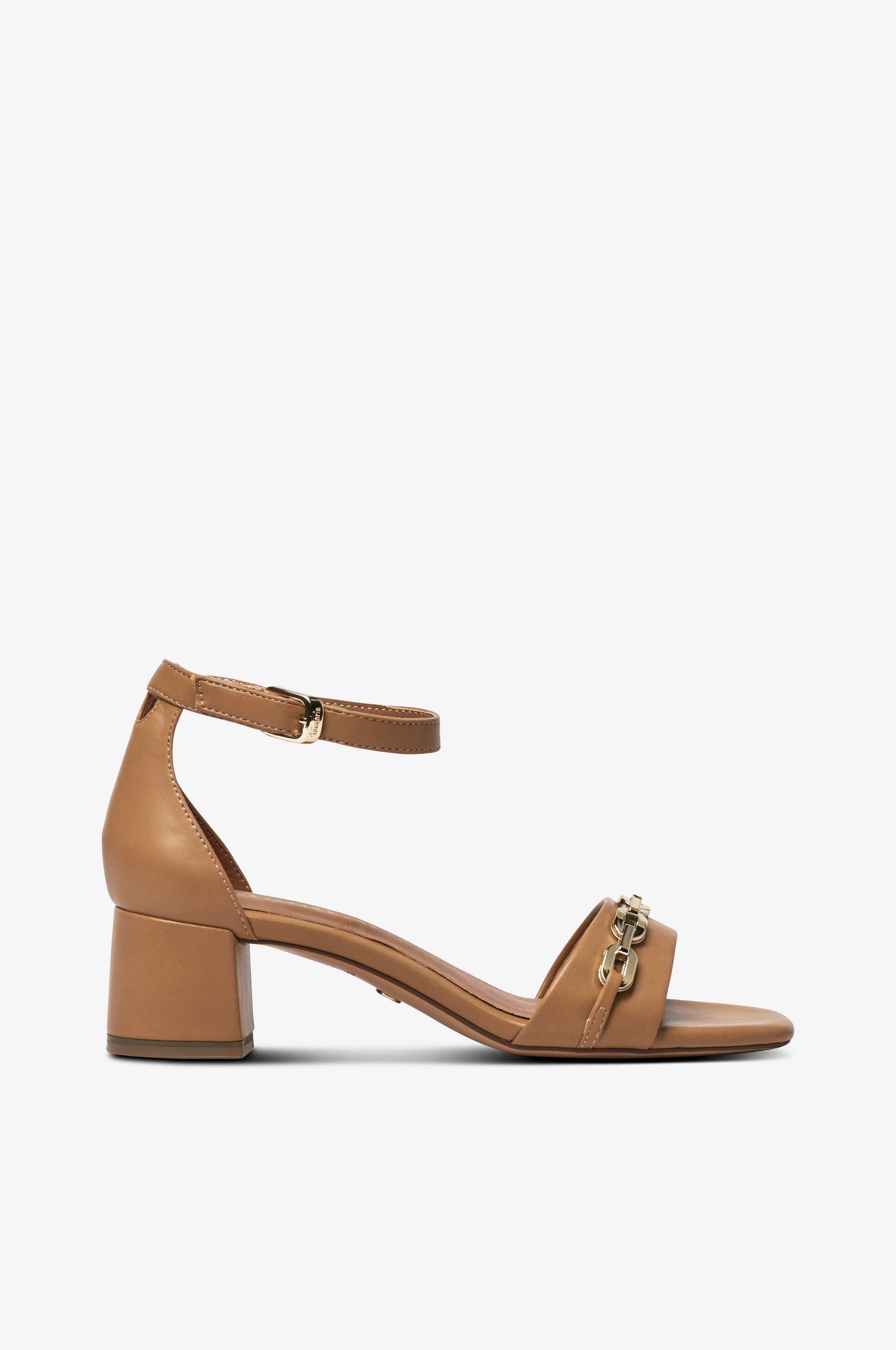 Sandaletit nahkajäljitelmää. Nelikulmainen kärki ja päällystetty tolppakorko. Nilkkaremmi, jossa sivulla säädettävä metallisolki. Jalan päällä remmi, jossa koristeellinen kullanvärinen metalliyksityiskohta. Koron korkeus 4 cm.
