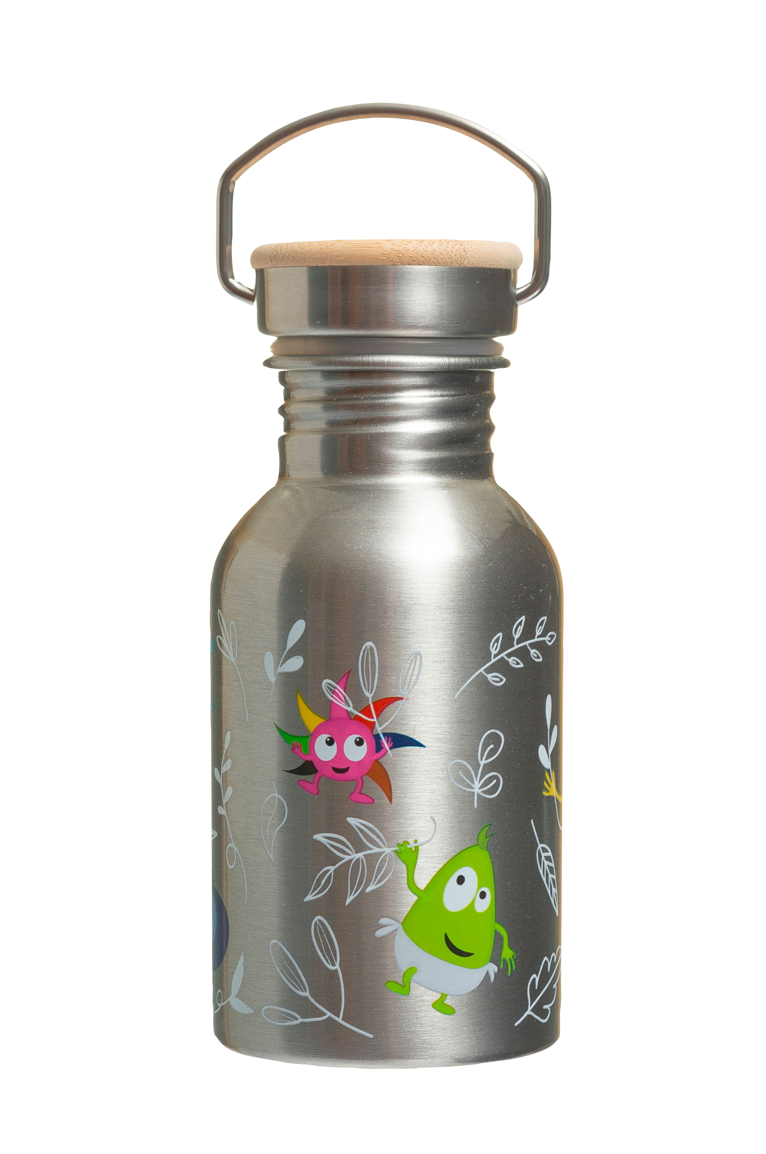 Ruostumattomasta teräksestä valmistettu vesipullo, jossa on babblers-kuvio ja puukansi.