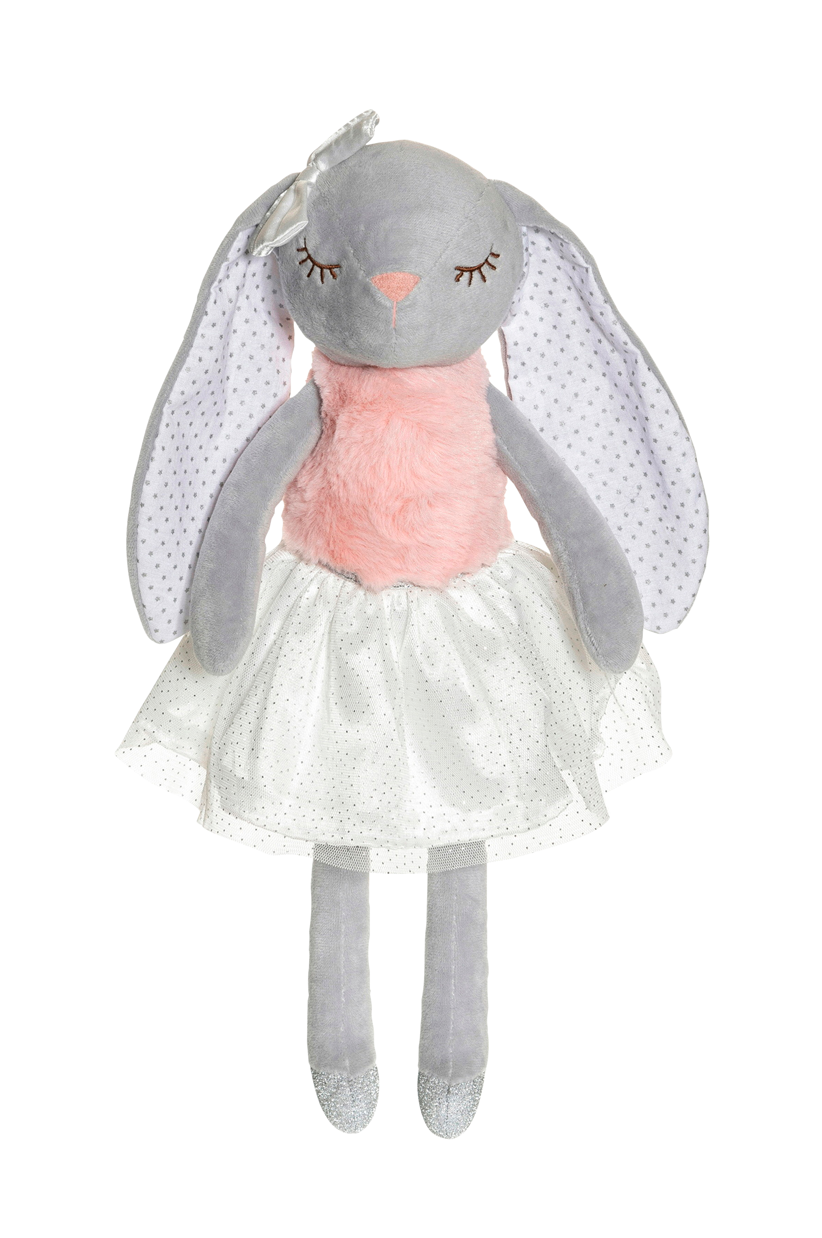 Sievällä vaaleanharmaasta plyysistä valmistetulla kanilla on tyllihame, turkisliivi ja hopeanhohtoisen ballerinat.