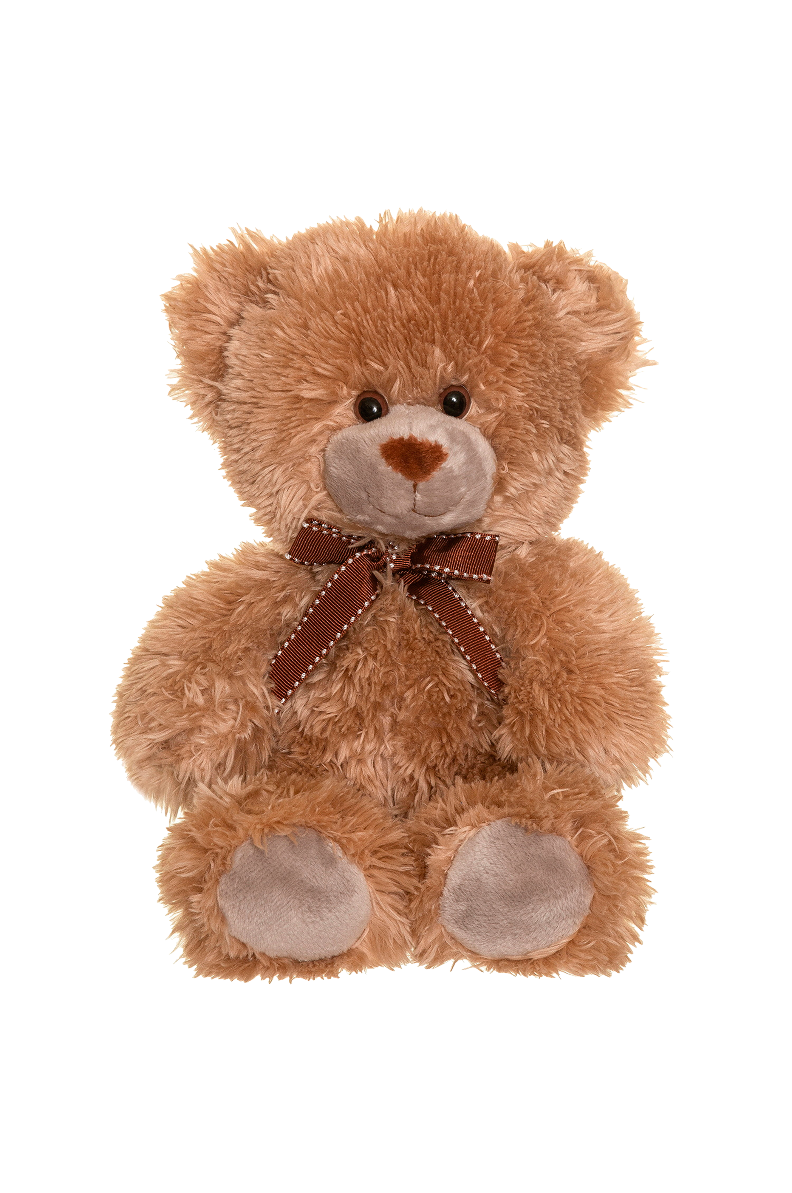Pehmeä ja suloinen nalle, jolla on pitkähkö ruskea turkki, isot ruskeat silmät ja rusetti kaulassa.