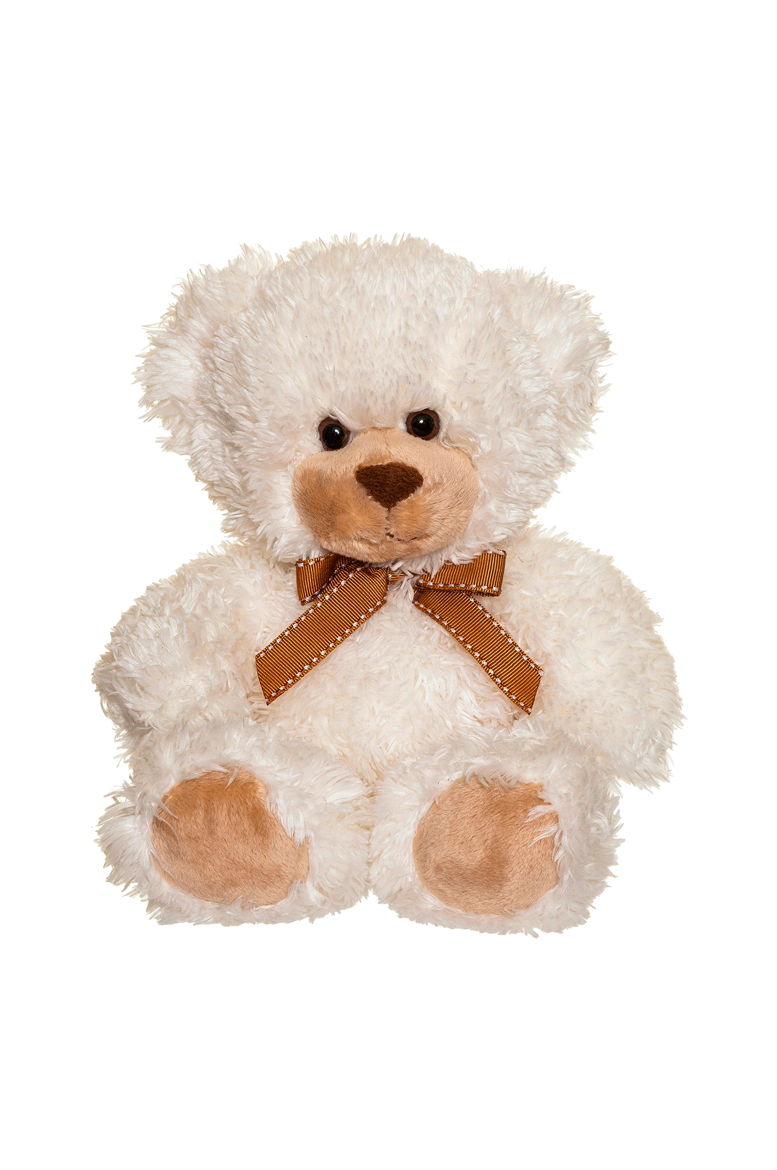 Pehmeä ja suloinen nalle, jolla on pitkähkö kermanvärinen turkki, isot ruskeat silmät ja rusetti kaulassa.