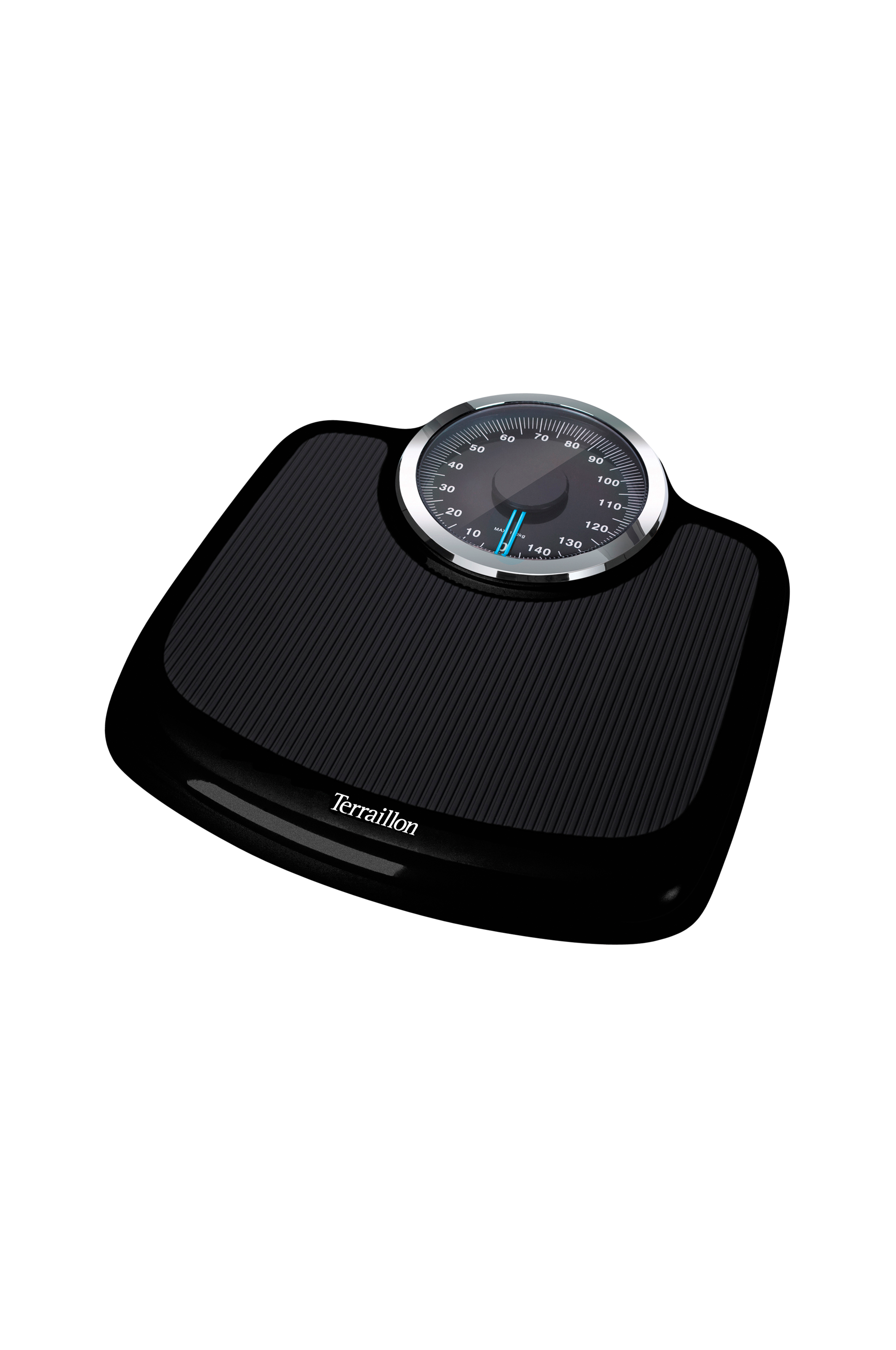 Retrohenkinen henkilövaaka, jossa krominväriset yksityiskohdat. Iso näyttö ja leveä viisari näyttävät lukeman selkeästi.