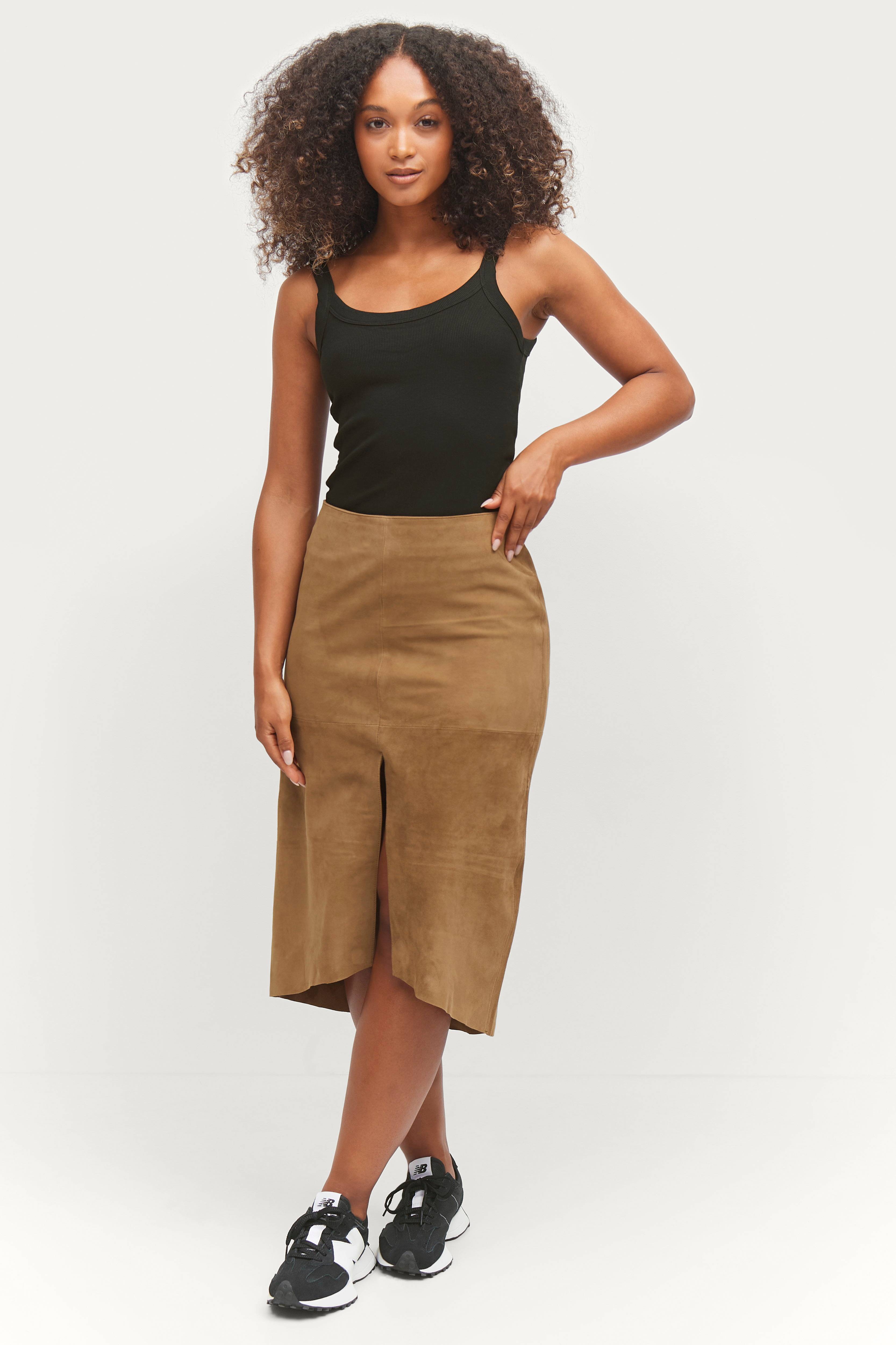 • Hame pehmeästä mokkanahkasta• Normaali istuvuus• Kätketty hakaskiinnitys takaosa• Vetoketju takaosa• Kudottu vuori• Halkio edessä• Raaka helma• Pituus: 73 cm koossa 36