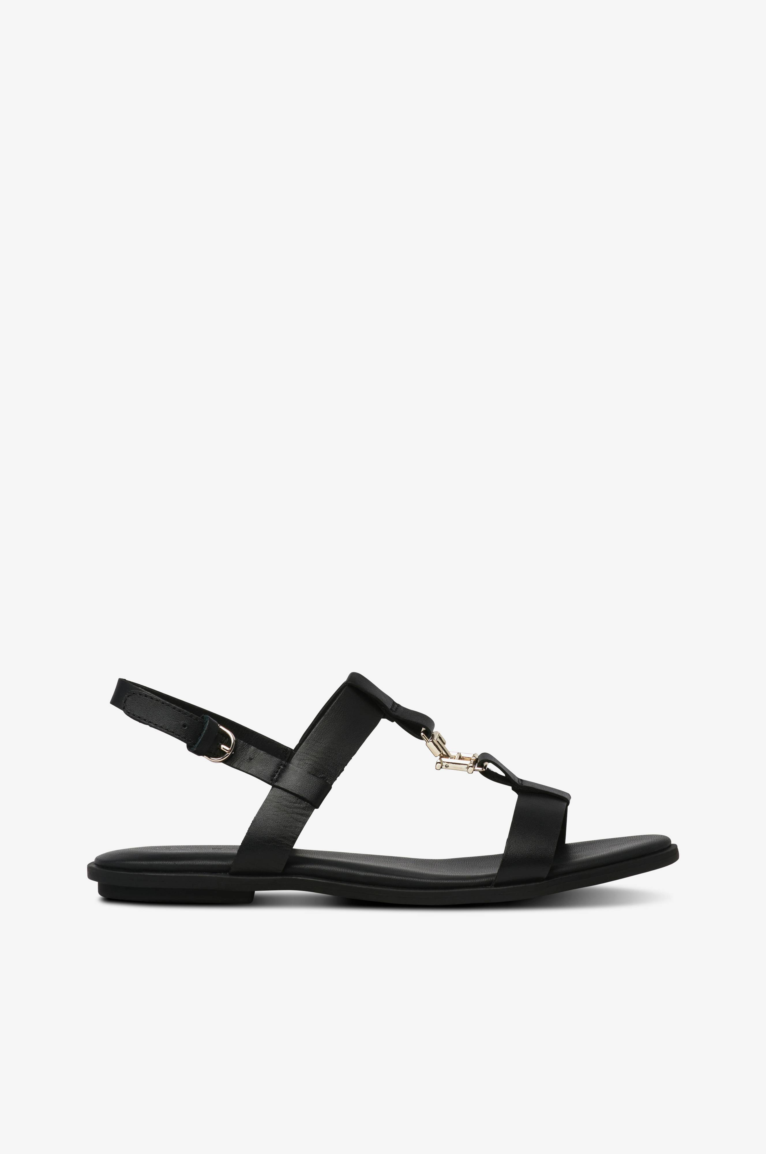 • Litteät sandaalit• Hihnat nahkasta• Metallilogo edessä• Solki nilkassa