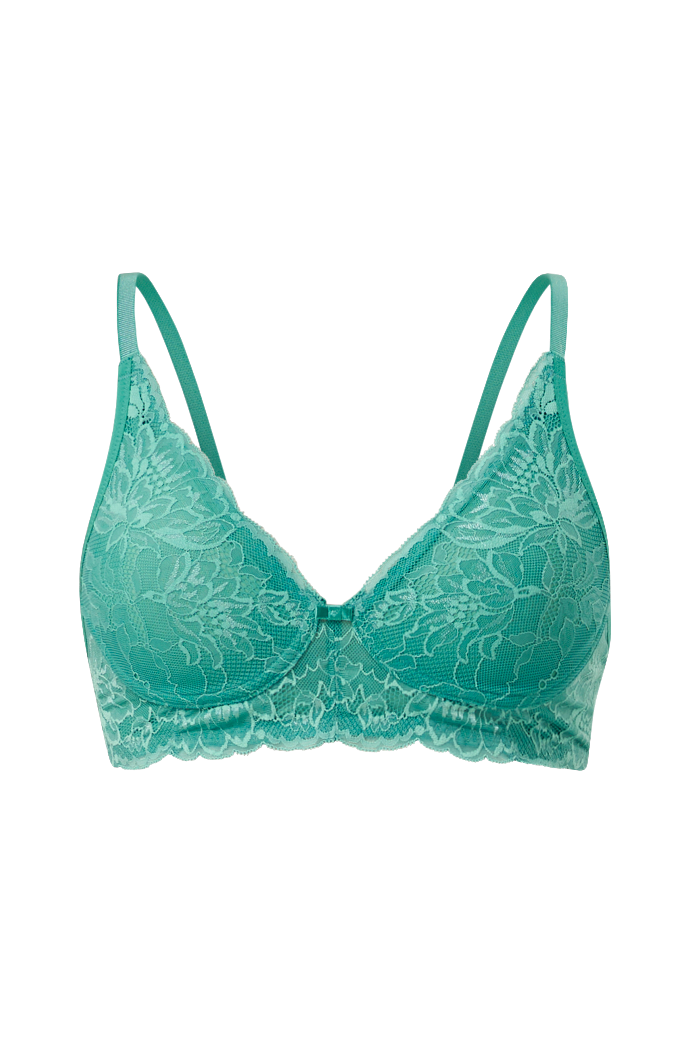 Kaarituettomat pitsikupit, joissa verkkovuori. Pehmeä kuminauha alareunassa. Säädettävät olkaimet ja hakaskiinnitys selässä.