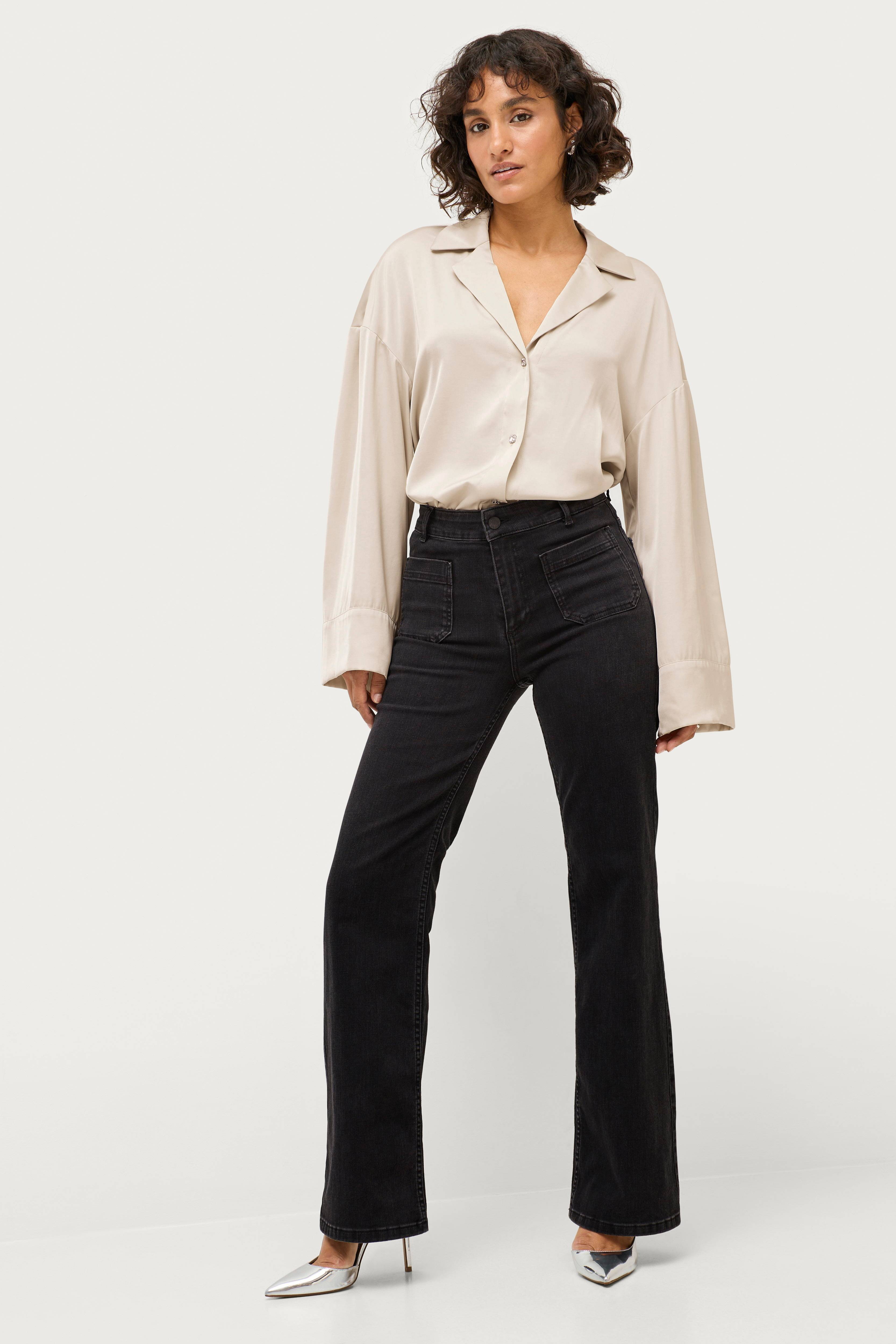 • Korkea vyötärö• Kapea istuvuus ylhäällä• Leveät jalat alhaalla• Kaksi taskua edessä• Kaksi takataskua• Vetoketjusepalus
