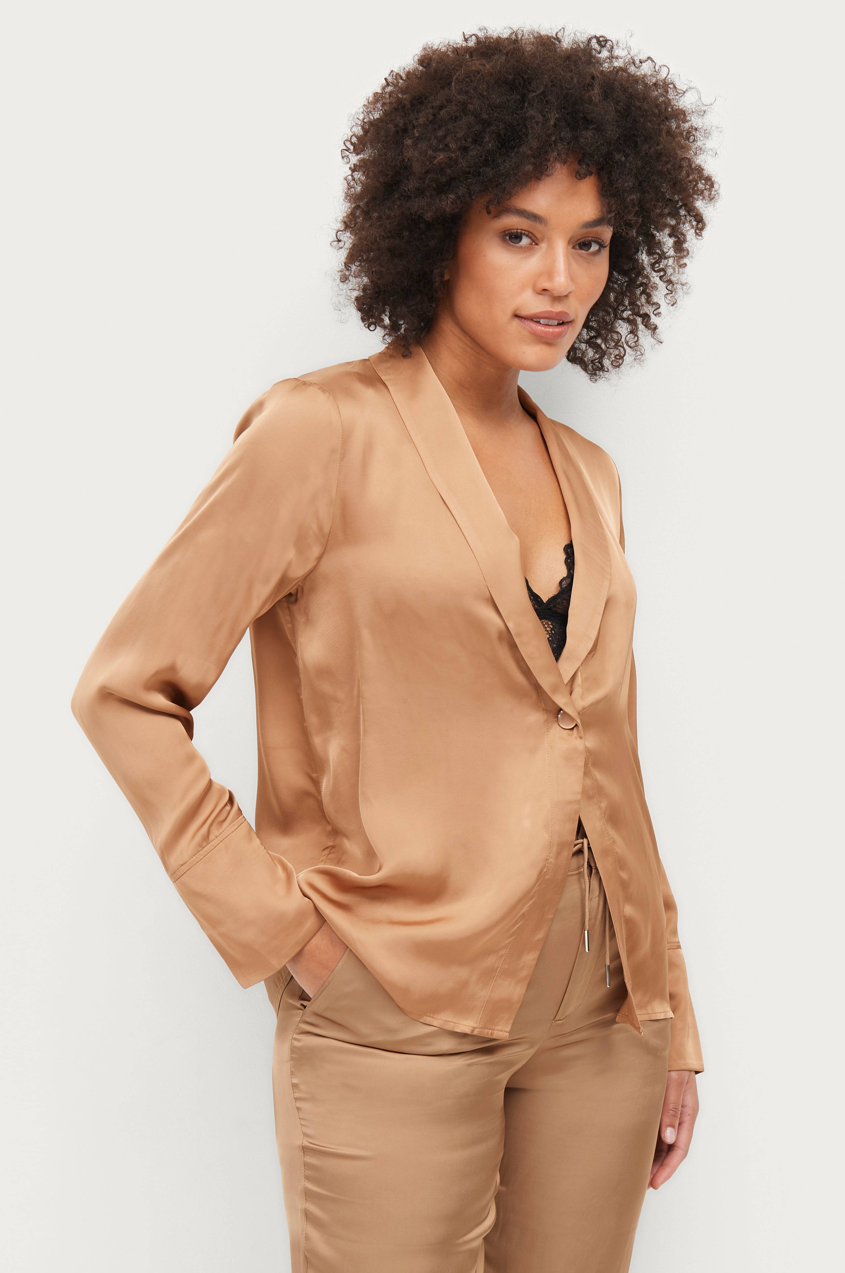 • Löysä istuvuus• Kiiltävä materiaali• Syvä v-kaula-aukko• Lukko yhdellä napilla• Pitkä hiha
