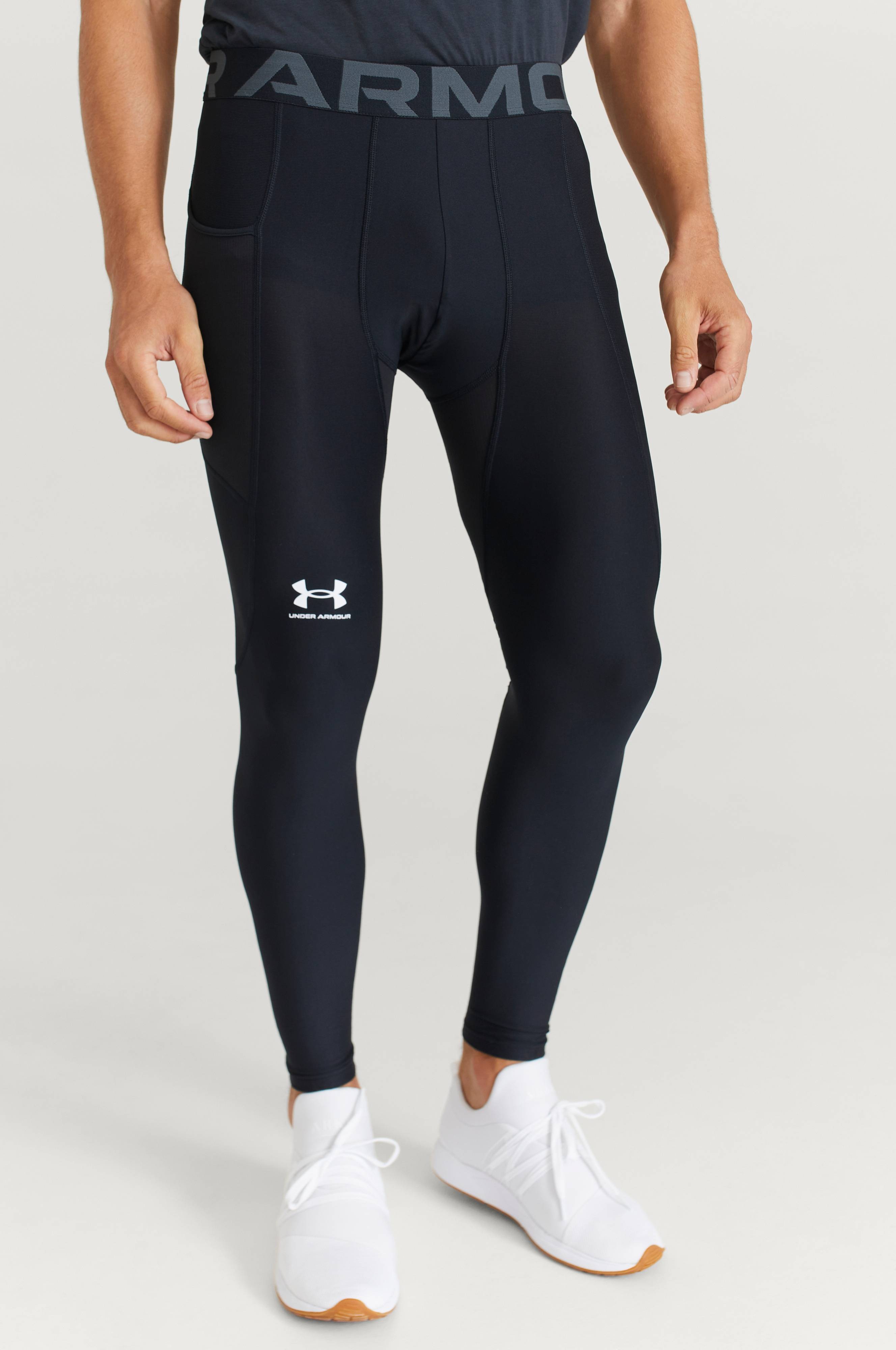 Under Armour -treenihousut, joiden materiaalissa on hyödynnetty HeatGear-teknologiaa. Housuissa on logollinen kuminauhareuna vyötäröllä ja yksi tasku. Pehmeää ja joustavaa materiaalia.