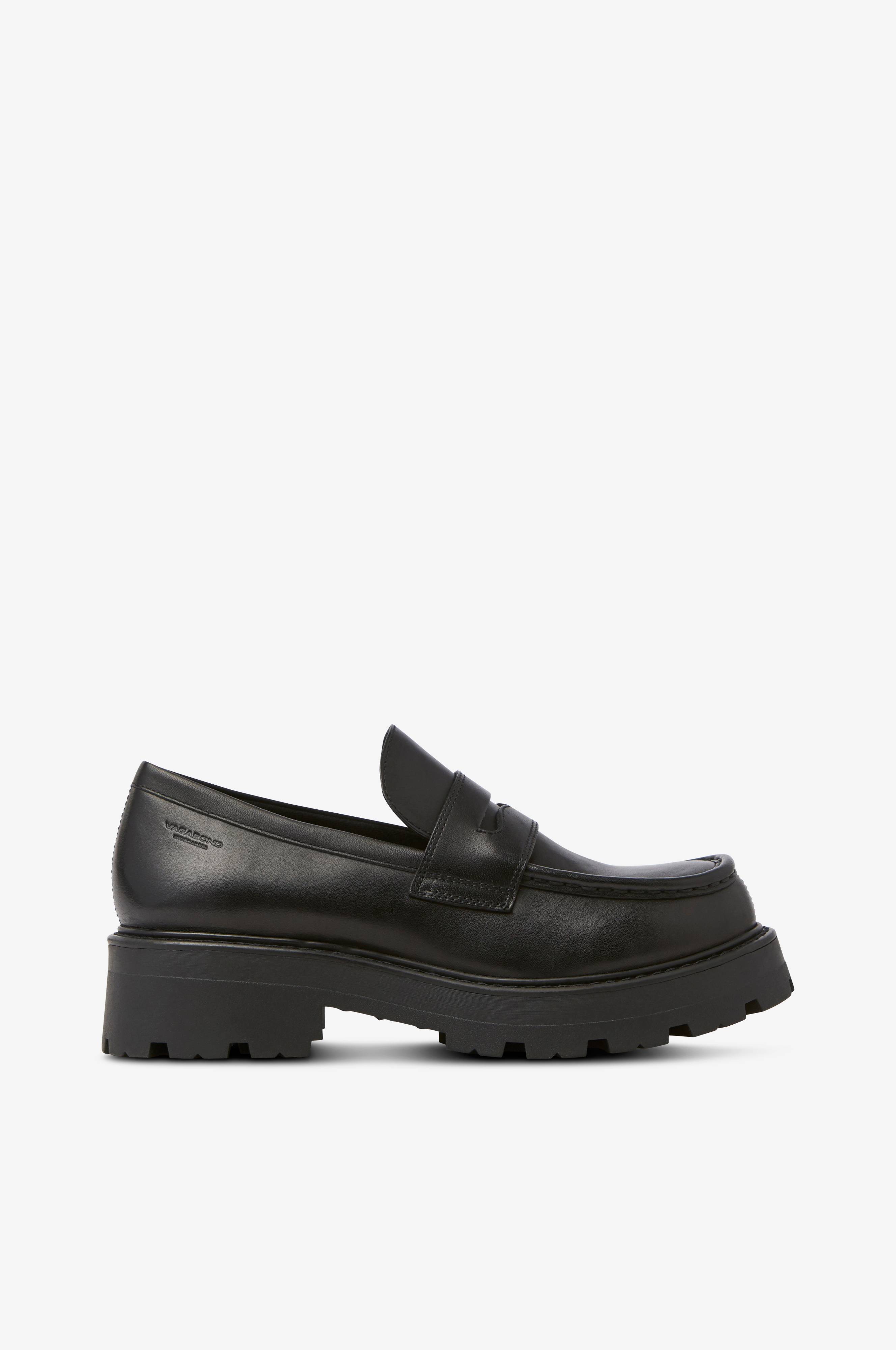 Vagabond Cosmo 2.0 -kengät. Nahkaloaferit, joissa pyöreä kärki ja korkea, karkeakuvioinen pohja. Nahkasisäpohja ja kangasvuori.Koron korkeus n. 4,5 cm. Pohjan korkeus n. 2,5 cm.