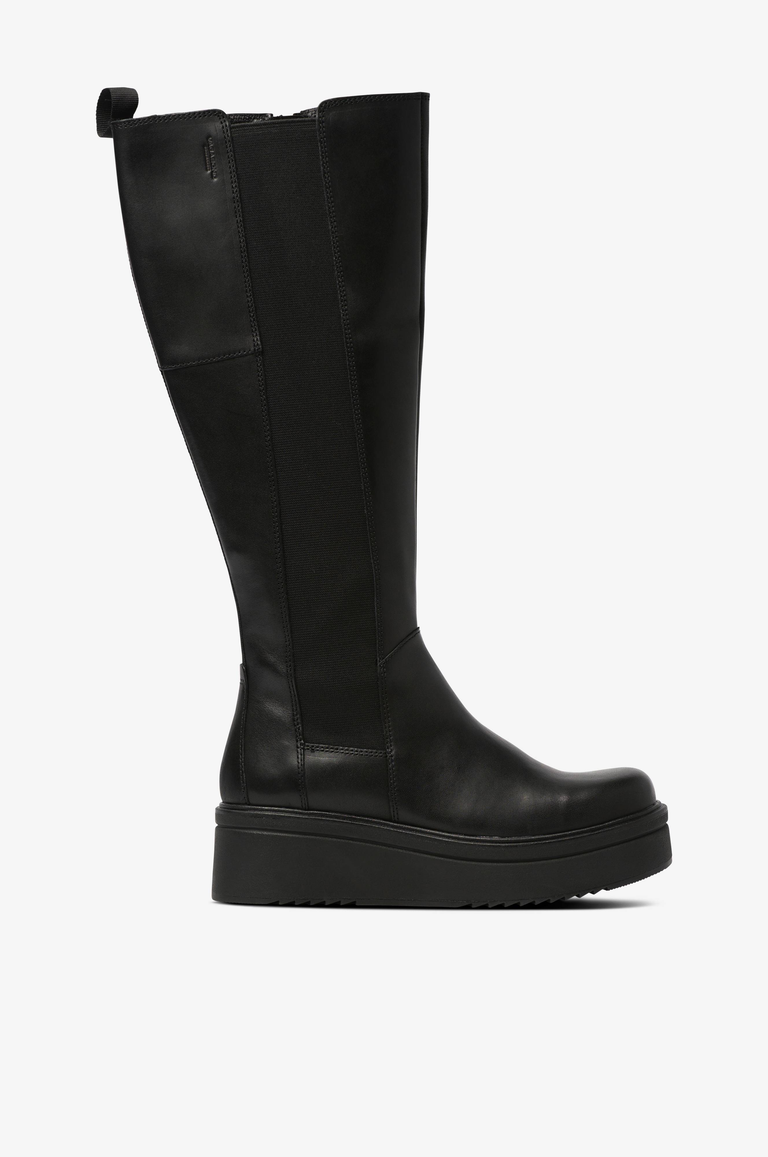 Nahkasaappaat, joissa on korkea pohja. - Leveä venyke varren ulkosivulla - Vetoketju sisäsivulla - Takana lenkki - Varren korkeus 39 cm - Koron korkeus 5 cm - Pohjan korkeus 3 cm