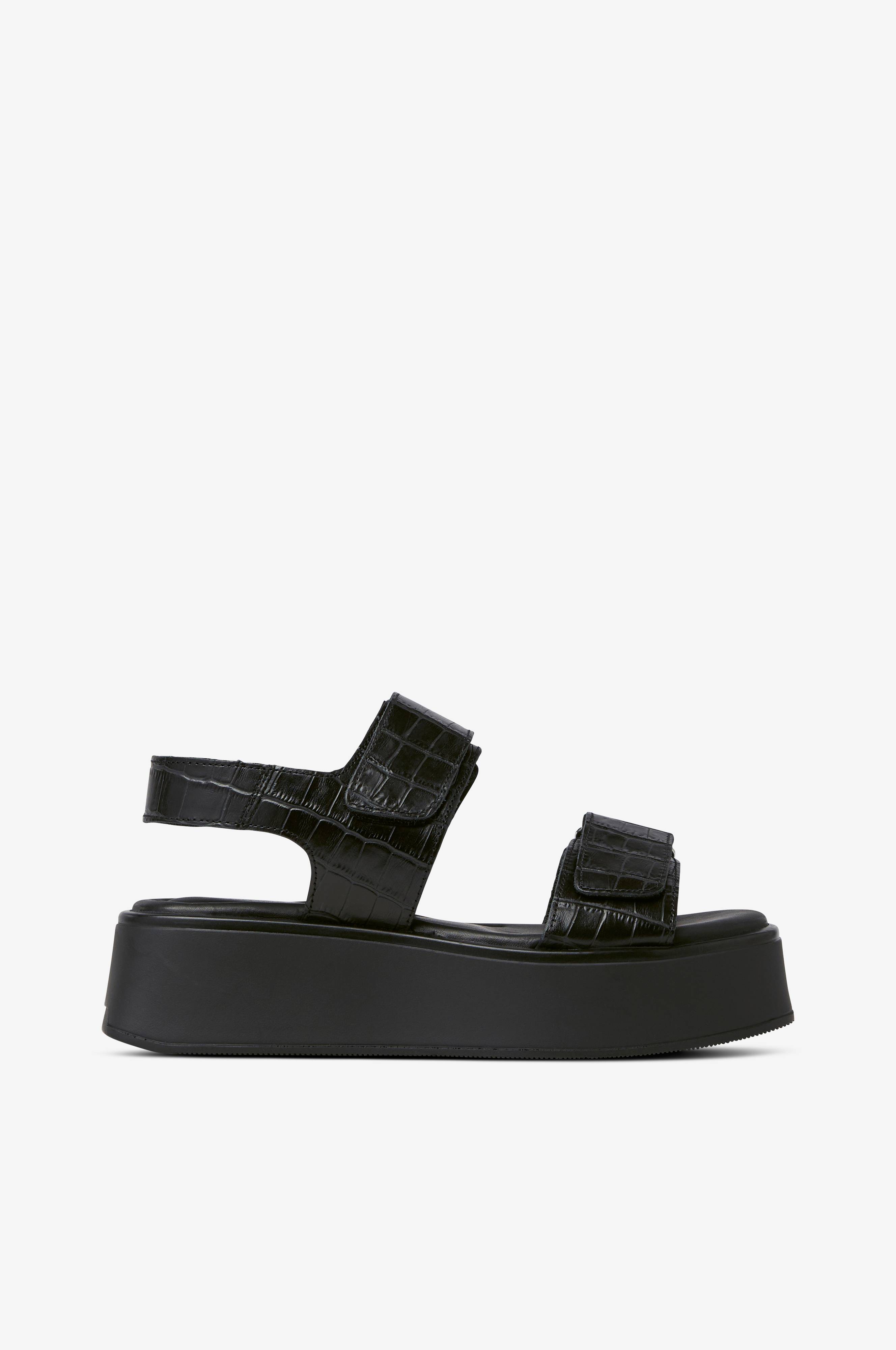 Sandaalit, joissa korkea korokepohja. Päällinen pehmeää krokotiilipintakuvioitua nahkaa. Jalan päällä kaksi säädettävää tarranauharemmiä. Pehmustettu, nahkapäällysteinen sisäpohja. Pohjan korkeus takaa n. 5 cm.