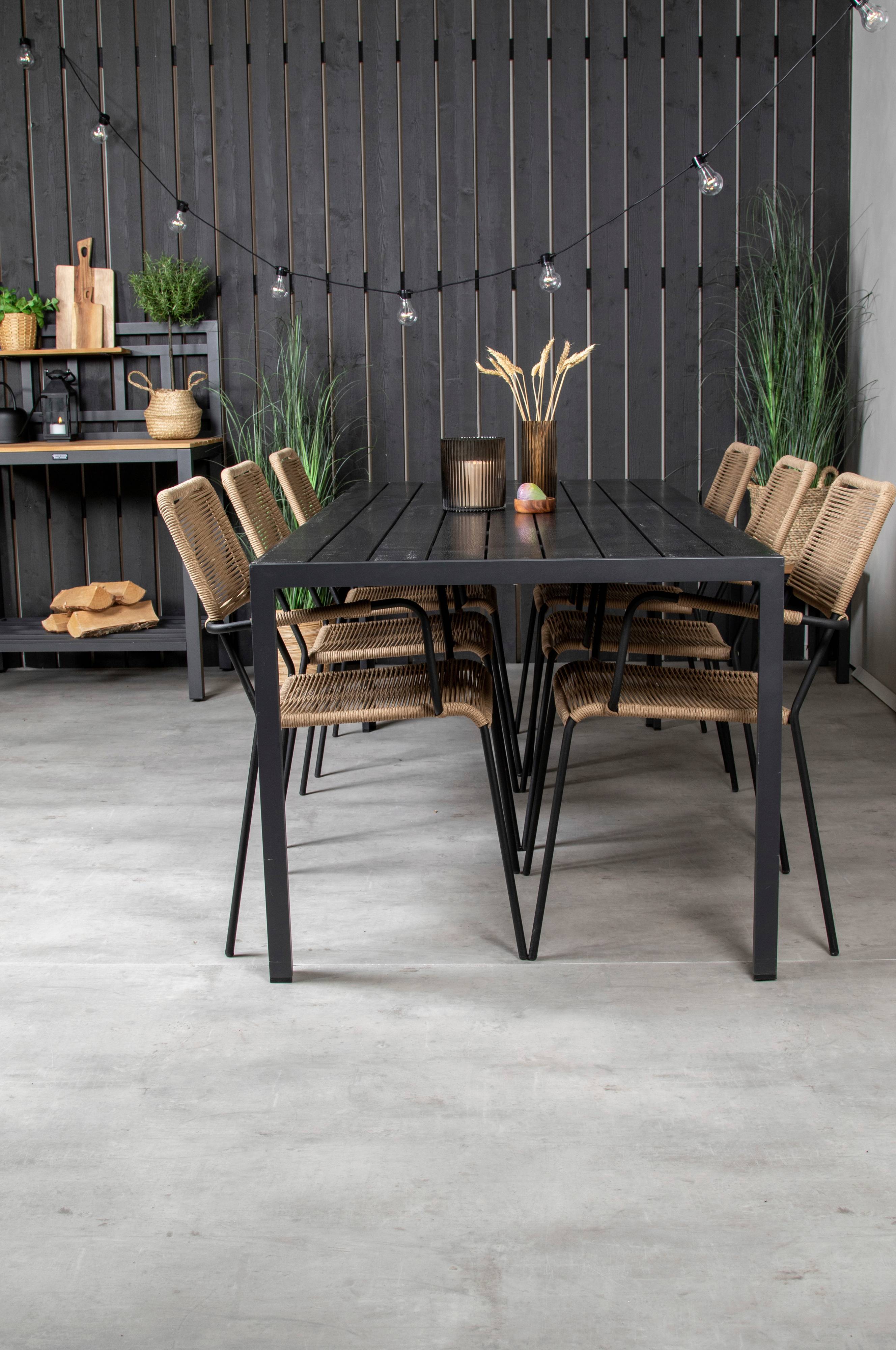 Bliss-ruokapöytä, jossa pöytälevy aintwood-materiaalia ja jalat alumiinia. Pöydän mitat: Pituus: 205 cm, leveys: 90 cm, korkeus: 74 cm. 6 Levis-tuolia, joissa narua ja alumiinijalat. Tuolin mitat: Kokonaiskorkeus: 85 cm, leveys: 55 cm, syvyys: 66 cm, istuinkorkeus: 47 cm. Pöytä ja tuolit on helppo koota.