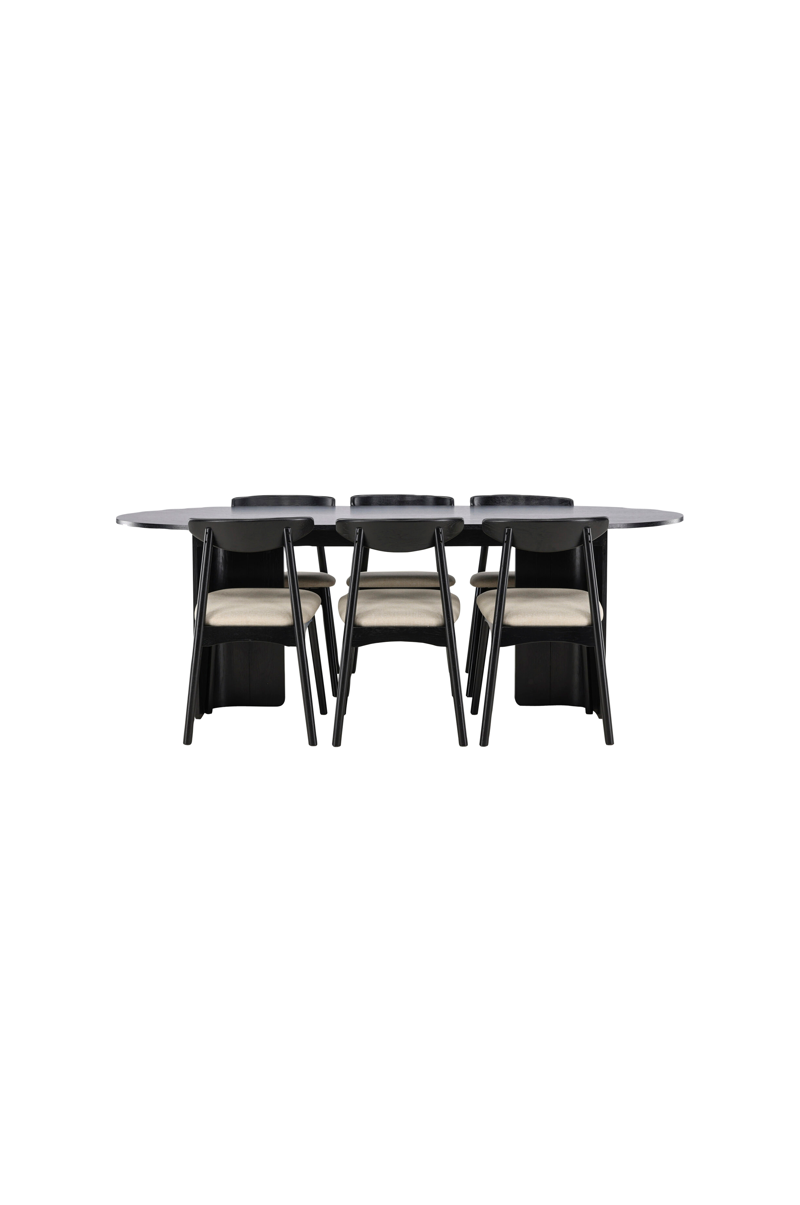 mukana tulevissa ven-tuoleissa on musta kehys, joka sopii yhteen pöydän kanssa, kun taas beige istuintyyny lisää lämpimän ja pehmeän kontrastin. Yhdessä ne muodostavat tasapainoisen koostumuksen, joka sopii jokapäiväisiin aterioihin yhtä hyvin kuin suurempiin kokoontumisiin.