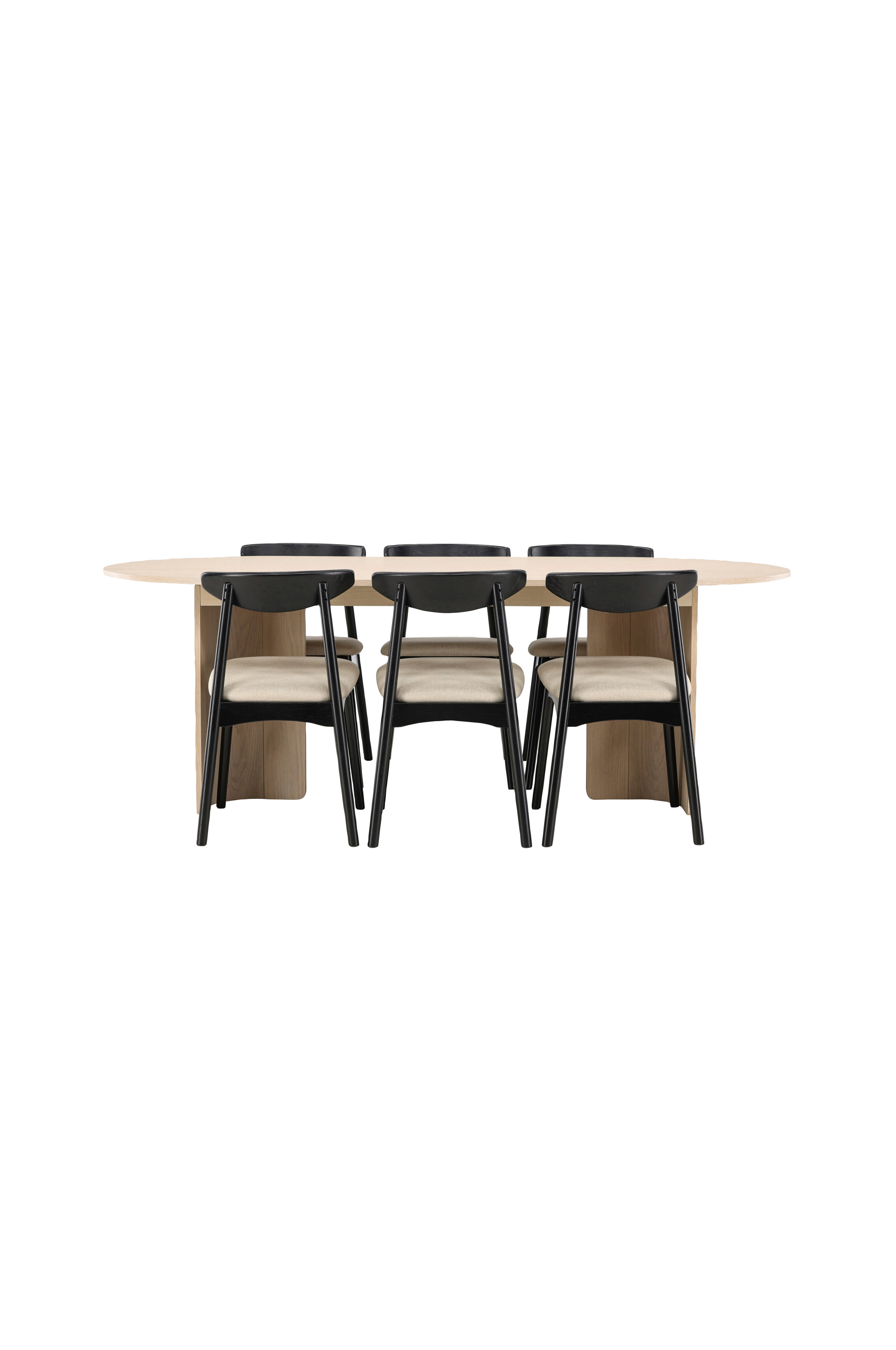 mukana tulevissa ven-tuoleissa on musta kehys, joka sopii yhteen pöydän kanssa, kun taas beige istuintyyny lisää lämpimän ja pehmeän kontrastin. Yhdessä ne muodostavat tasapainoisen koostumuksen, joka sopii jokapäiväisiin aterioihin yhtä hyvin kuin suurempiin kokoontumisiin.