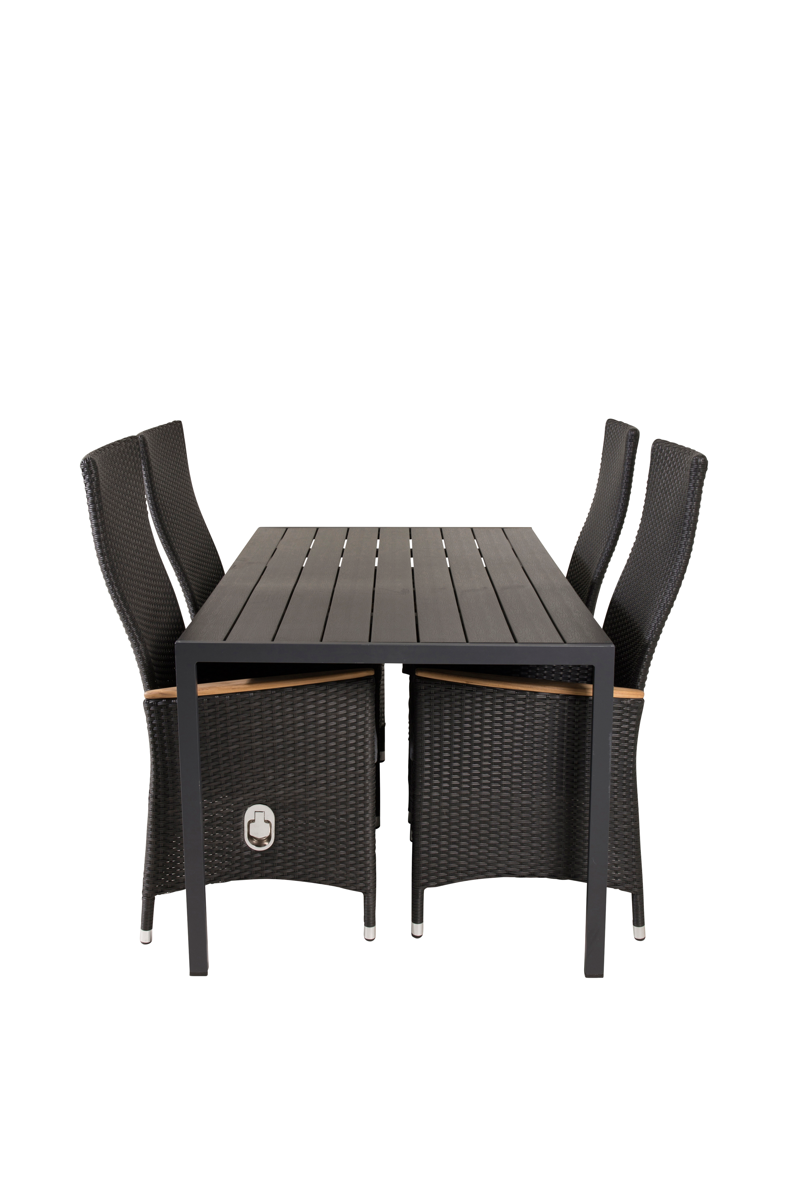Break-ruokapöytä, jossa polywood-pöytälevy ja alumiinijalat. Neljä säädettävää Padova-tuolia, joissa istuinosa synteettistä materiaalia, polyesteriä ja puujäljitelmää. Alumiinijalat. Pöytä ja tuolit on helppo koota. Pöydän mitat: Pituus: 150 cm, syvyys: 90 cm, korkeus: 74 cm. Tuolin mitat: Istuinleveys: 47 cm, istuinsyvyys: 46 cm, istuinkorkeus: 42 cm.