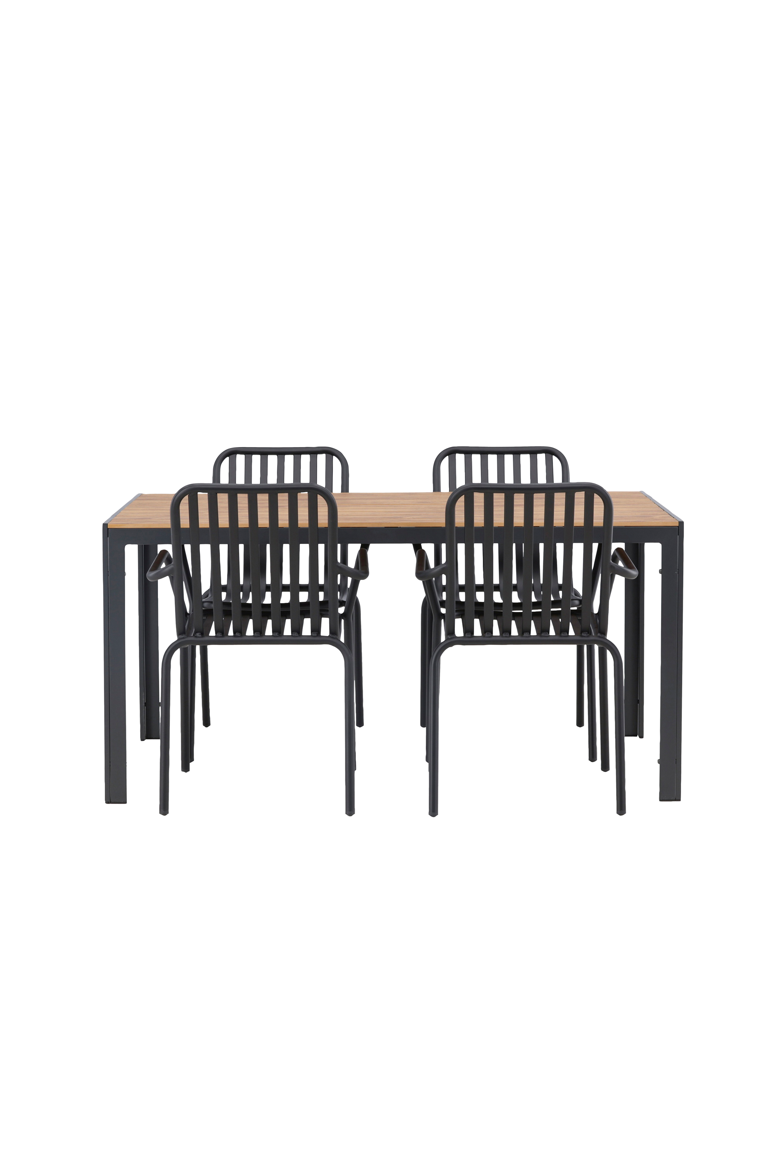 Hanki ulkotilaan trendikäs, yhtenäinen ja katseita keräävä ruokailuryhmä! Suorakulmaisessa Break-ruokapöydässä on suoralinjainen muotoilu ja klassinen pohjoismainen design. Pöytälevy on vaneria ja jalat alumiinia. Tässä tyylikkäässä ruokailuryhmässä pöytään on yhdistetty 4 Peking-sarjan ruokapöydän tuolia. Tuolin rimoista koostuva rakenne ja nokinen väri tekevät siitä modernin ja ajattoman tuntuisen. Alumiinista valmistettu tuoli on helppo siirtää. Integroidut käsinojat lisäävät mukavuutta. Täällä istut pitkään ja nautit olostasi terassilla!
