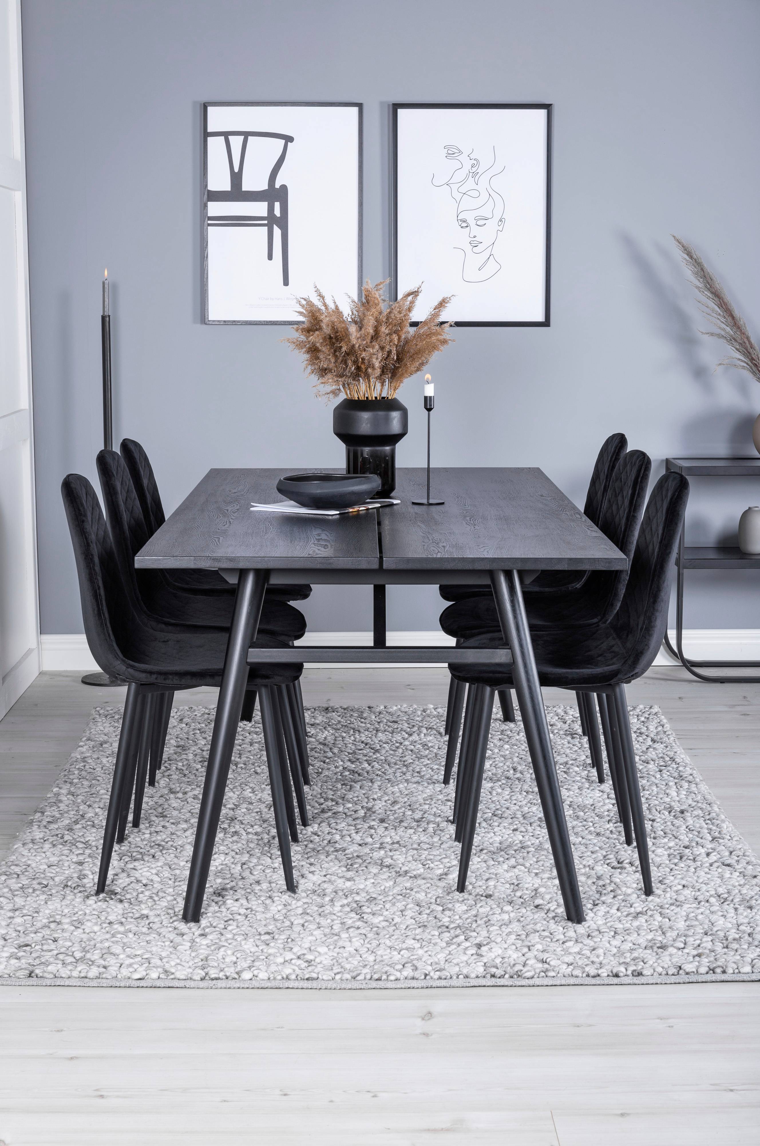 Jatkettava Saltö-ruokapöytä, jossa tammiviilutettu MDF-pöytälevy ja metallijalat. Kuusi Penally-tuolia, joissa samettipäällysteinen istuin koristesaumoin ja metallijalat. Tuolin mitat: Istuinleveys: 44 cm, istuinsyvyys: 39 cm, istuinkorkeus: 48 cm. Pöytä ja tuolit on helppo koota.