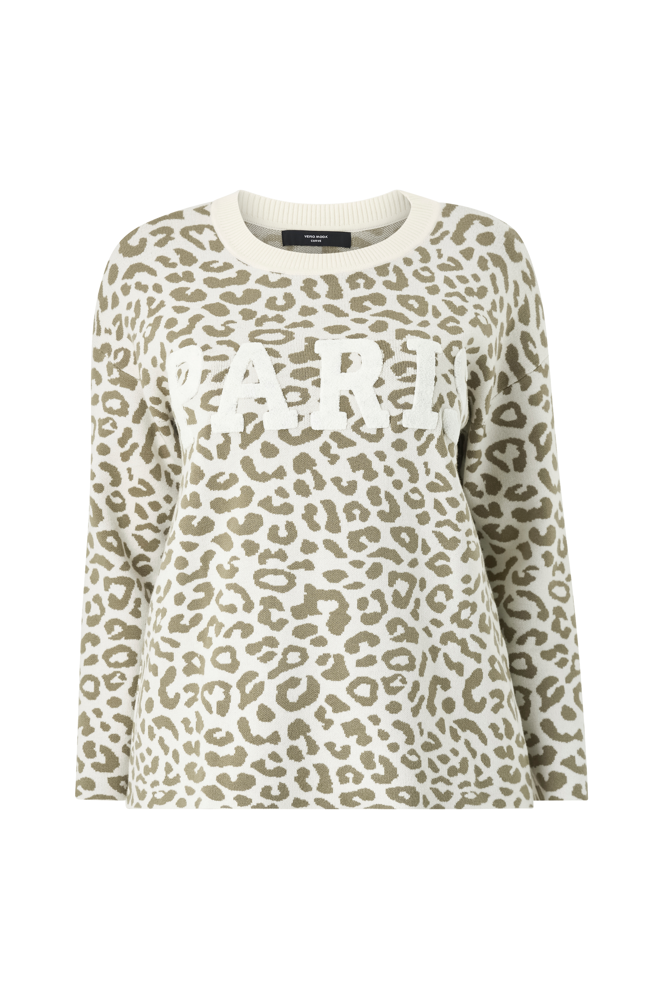 • Tiheäsilmukkainen, leopardikuvioinen pulloveri viskoosisekoitteesta• Pyöreä, ribattu kaula-aukko• Teksti edessä• Plus-koot