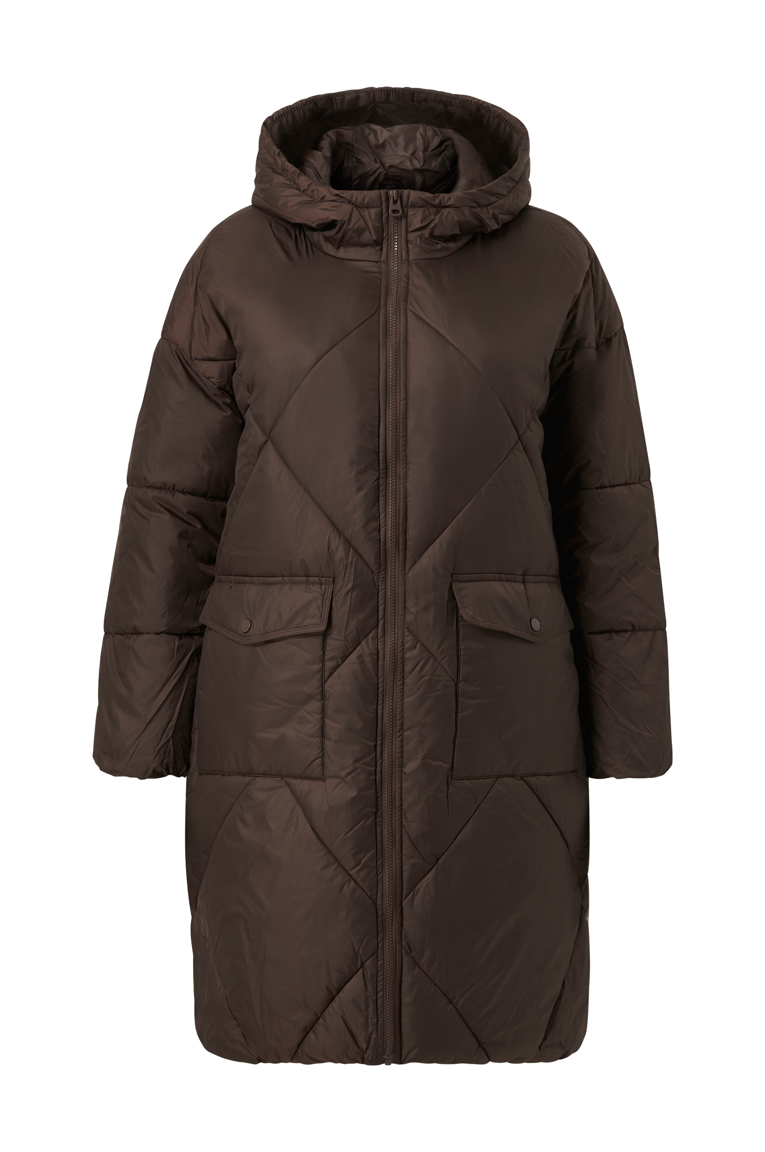 • Tikattu, topattu takki • Kiinnitetty huppu • Vetoketju • Kaksi taskua neppareilla ja sivuavauksilla • Joustonauha hihansuissa • Plus-koot • Pituus: 104 cm koossa 44 • Tuote sisältää kierrätettyä materiaalia, jonka käyttö vähentää jätteen määrää ja säästää luonnonvaroja.