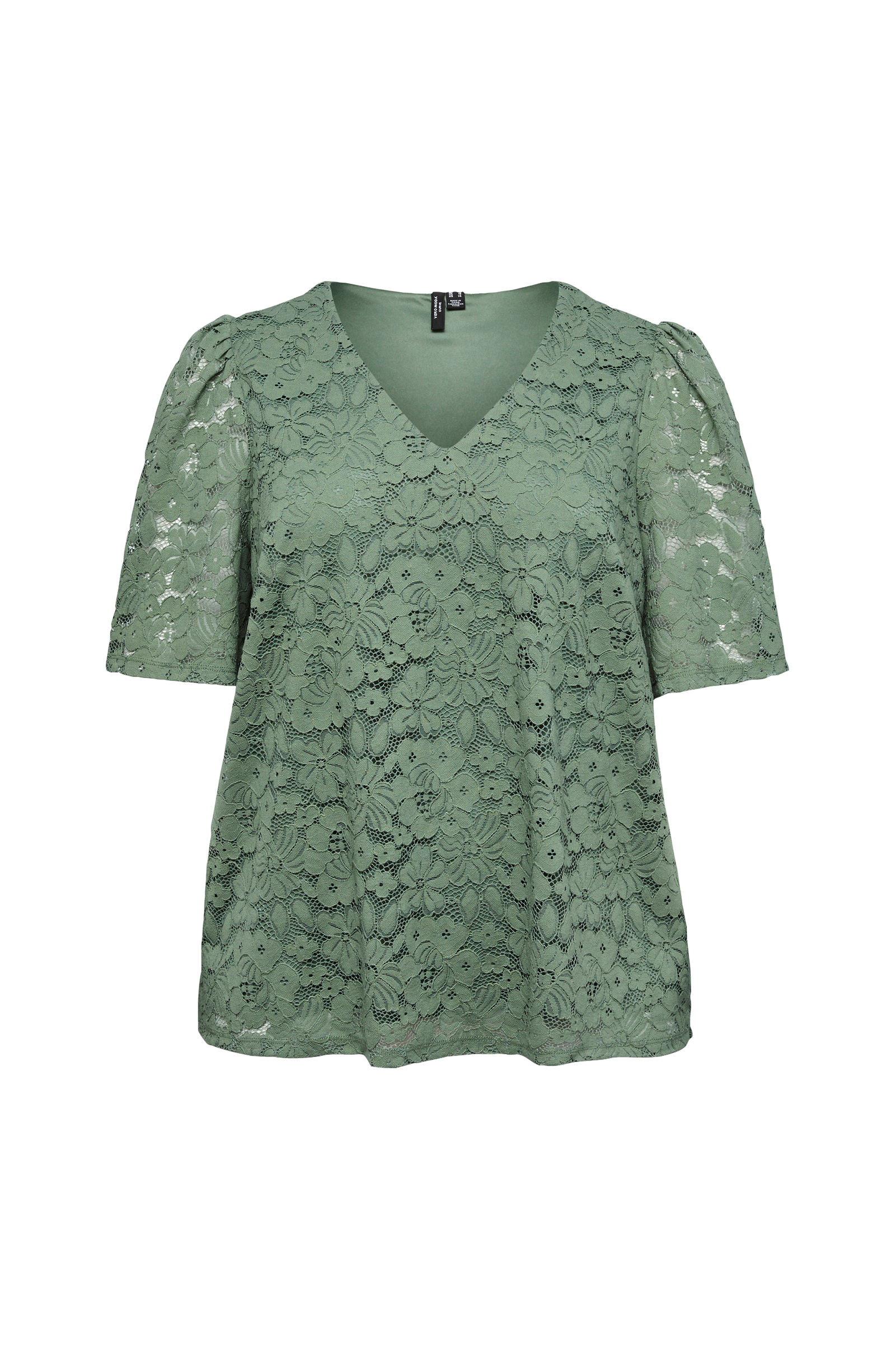 • Toppi pitsistä trikoovuorilla• V-muotoinen pääntie• Lyhyet puhvihihat• Plus-koot