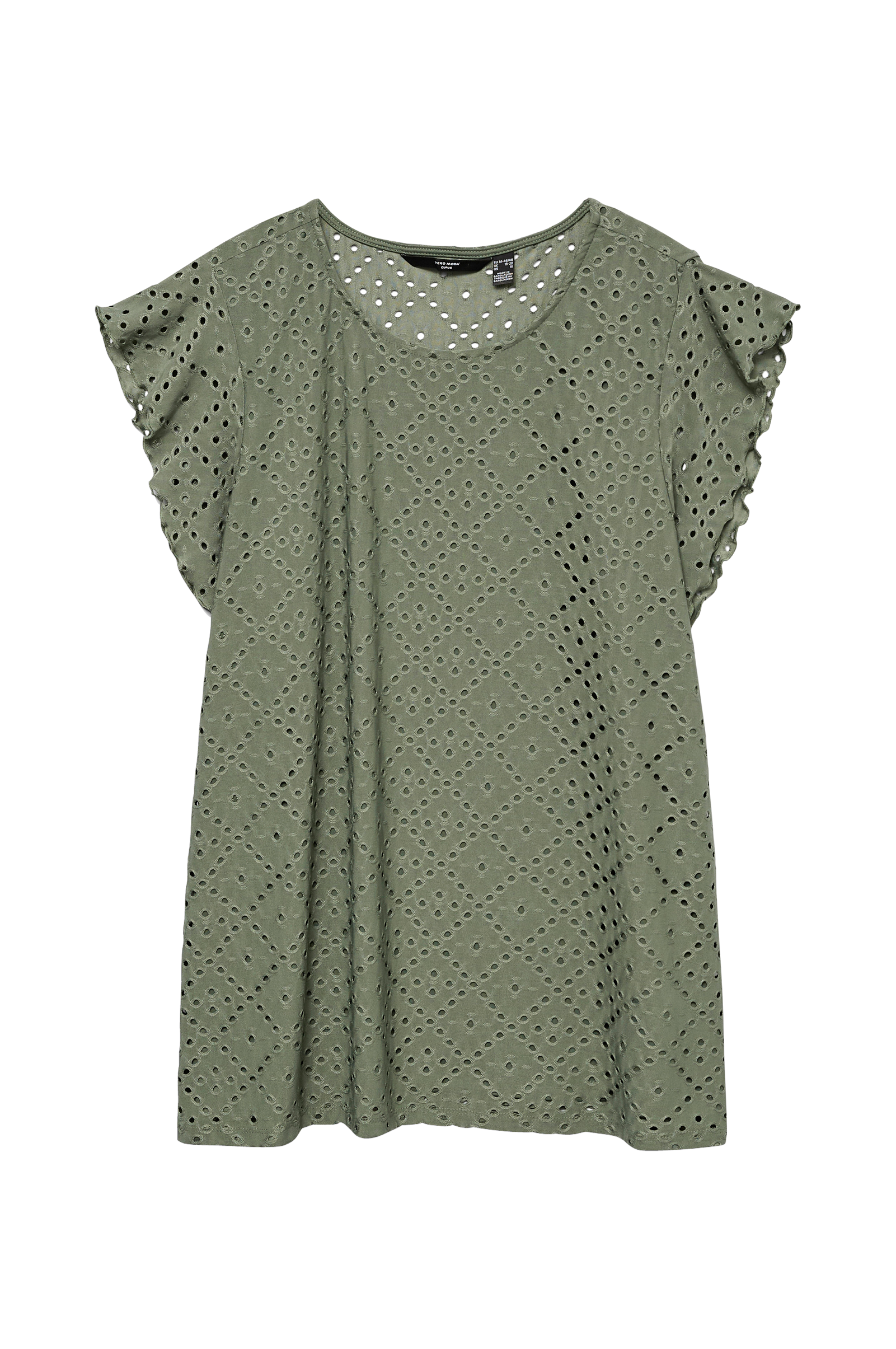 • Toppi kirjaillulla reikäkuvioinnilla• Joustava materiaali• Lyhyet röyhelöhihat• Trikoovuori edessä• Plus-koot