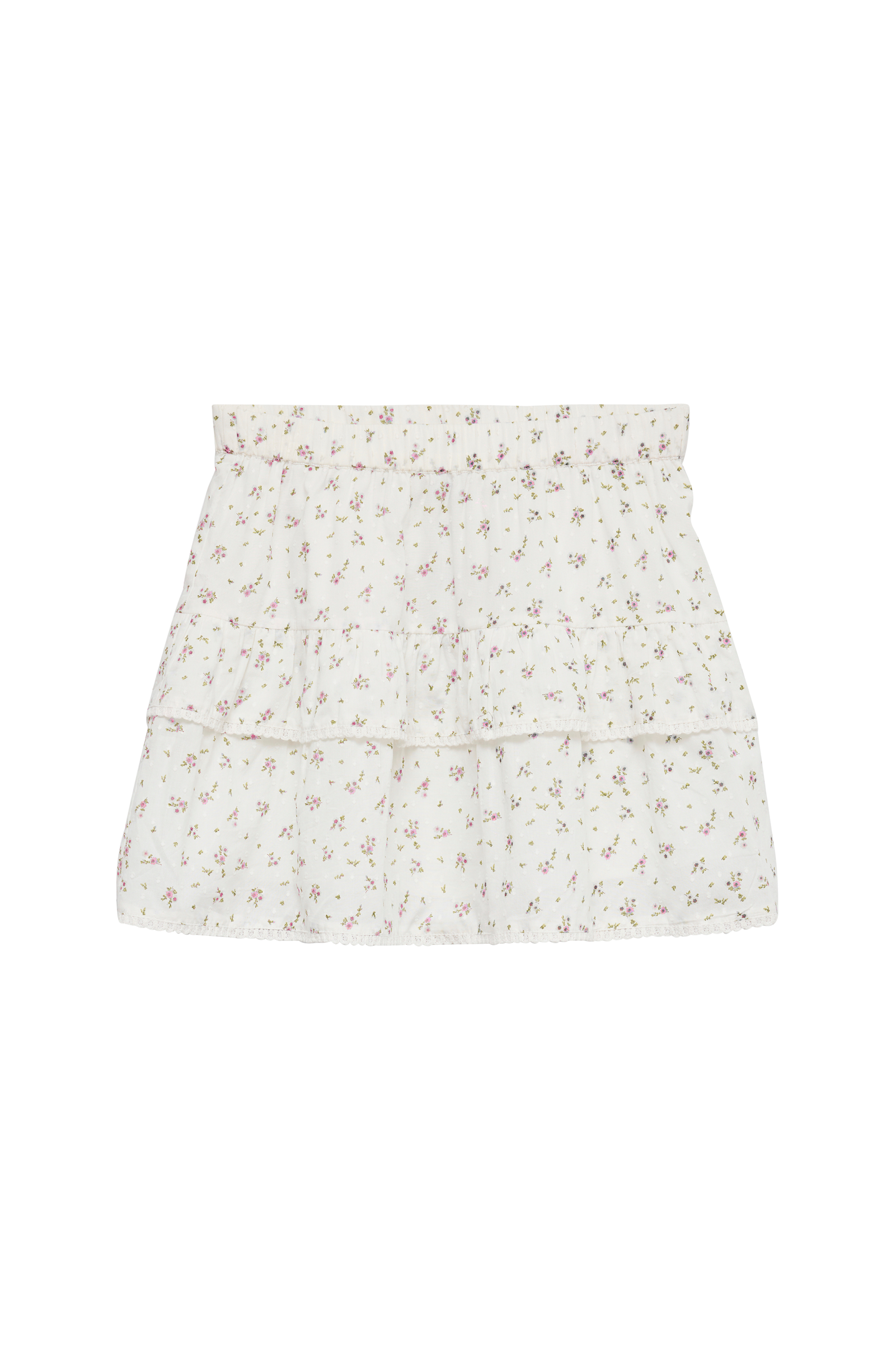 • Lyhyt, vuorattu röyhelöhame tupsuilla• Pitsireuna röyhelöiden ympärillä• Sisäinen kuminauha vyötäröllä