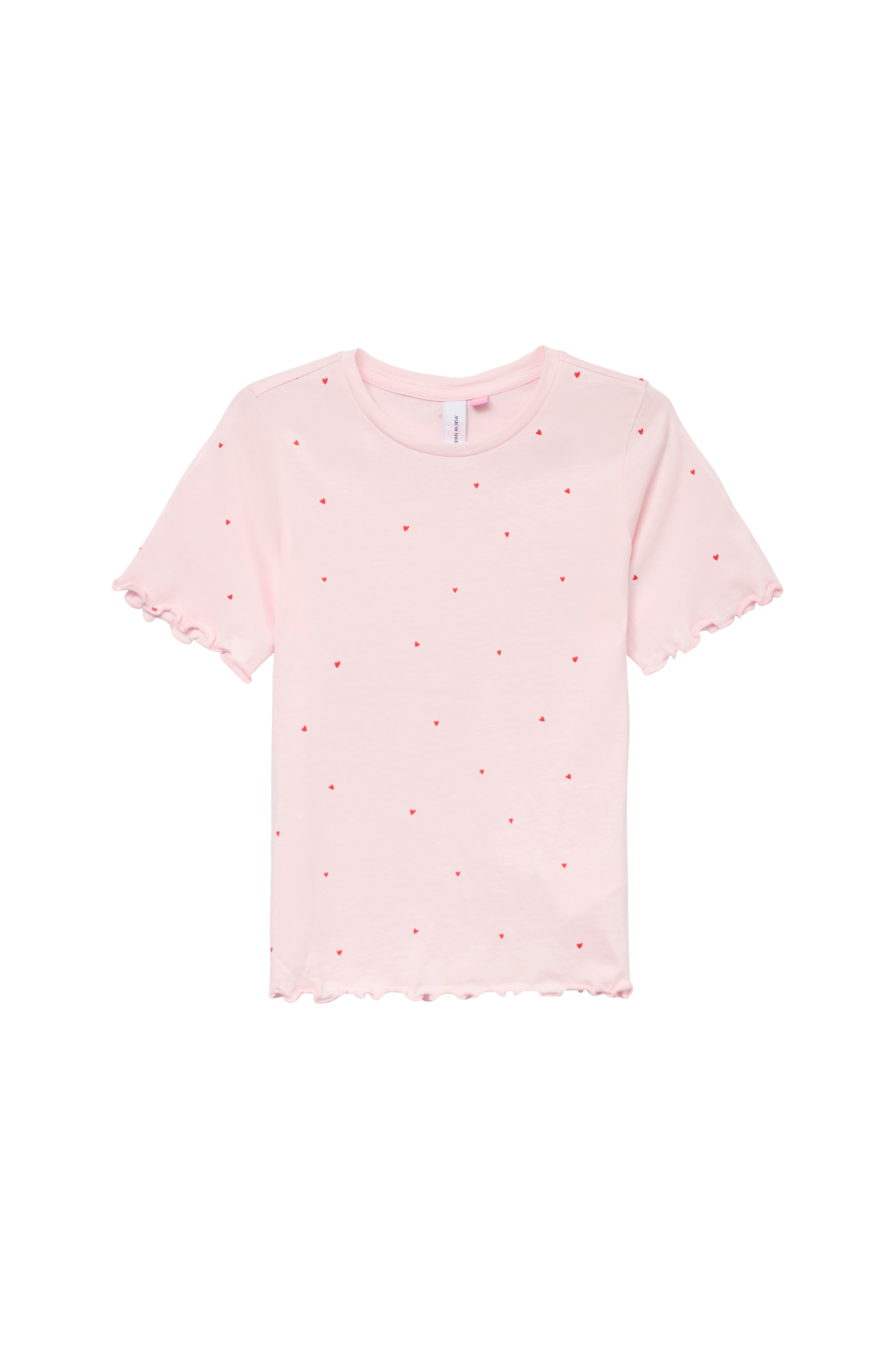 • T-paita puuvillasta painetuilla sydäneillä kauttaaltaan• Pyöreä pääntie• Lyhyet hihat aaltoilevalla reunalla• Aaltoileva helma