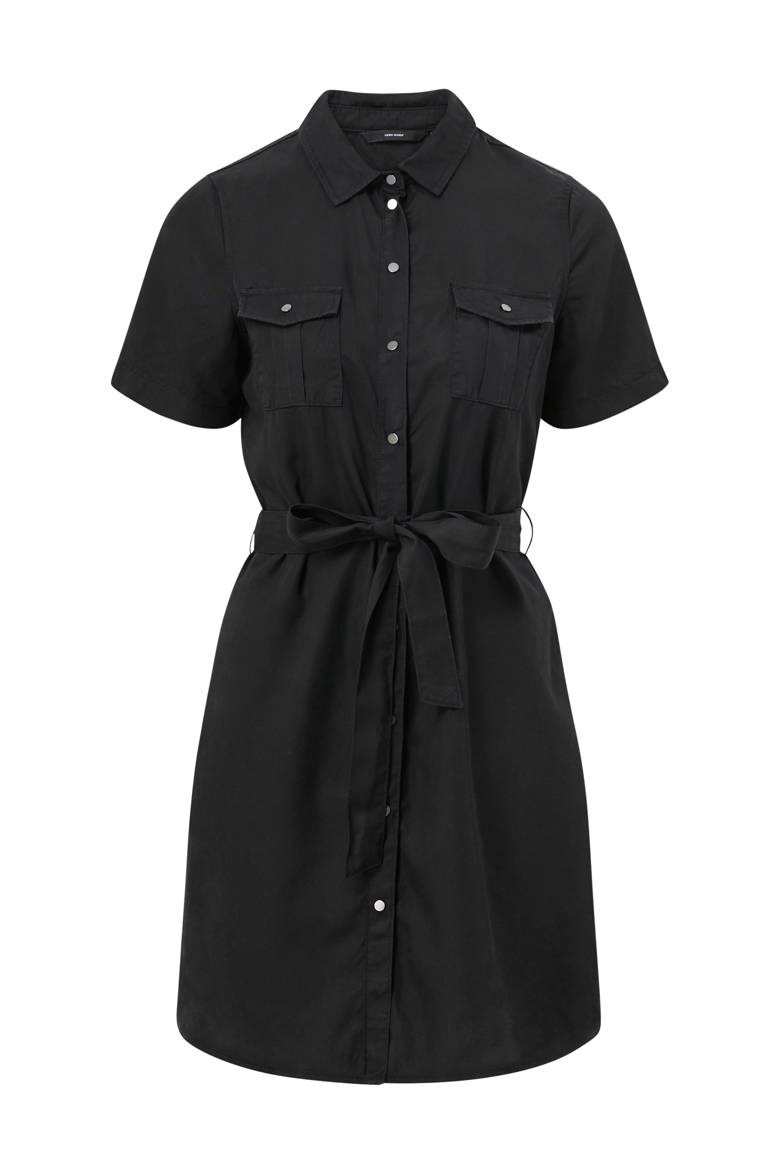 Mekko pehmeää denimiä. Hieman vartalonmyötäinen malli, jossa solmimisvyö vyötäröllä. Lyhyet hihat, pieni kaulus ja edessä painonapit helmaan asti. Kaksi kannellista rintataskua ja pyöristetty helma. Pituus n. 93 cm koossa S.