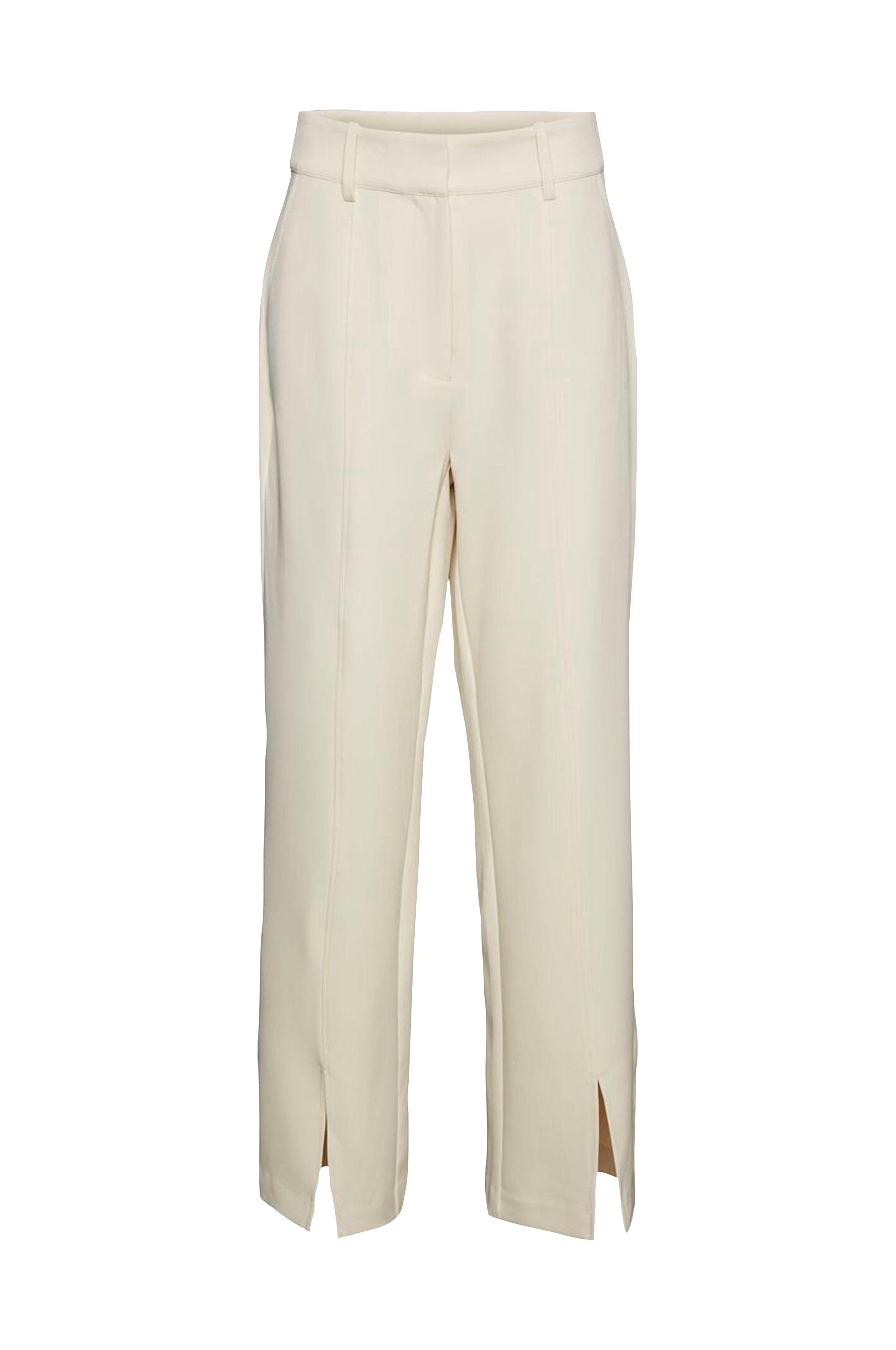 Housut joustavaa kangas. Korkea vyötärö. Vyölenkit, vetoketju ja piilohakaskiinnitys. Kaksi taskua edessä. Halkiot edessä lahkeensuissa. Lahkeen sisäpituus n. 80 cm koossa S.