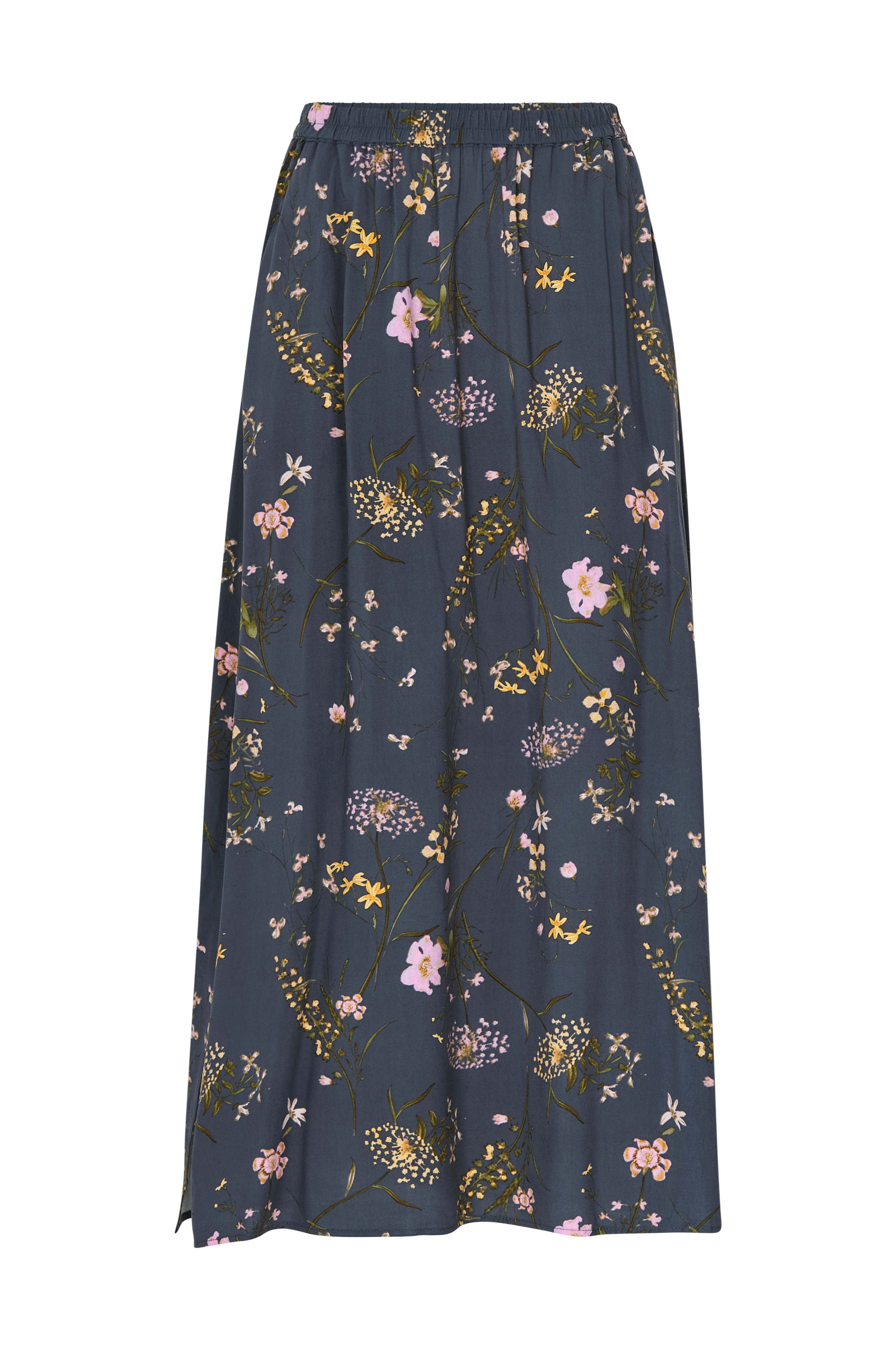 Levenevä maksihame myötäilevää materiaalia. Päälleommellussa vyötärönauhassa upotettu kuminauha ja kaksi viistoa taskua edessä sekä korkea halkio helmassa sivuilla. Pituus n. 91 cm koossa S.
