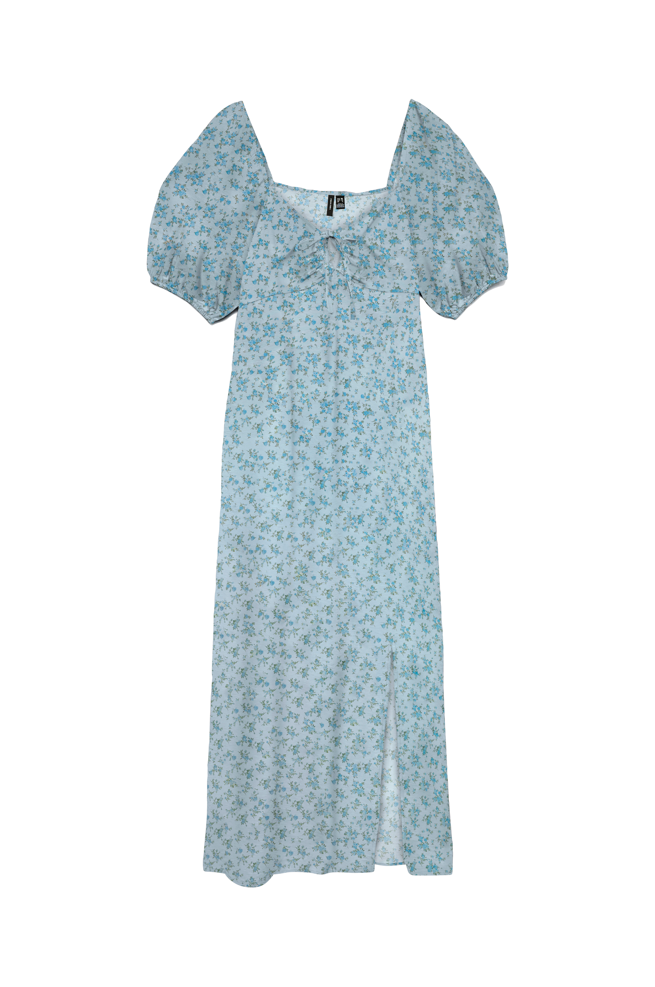 • Pitkä, kuvioitu mekko• Syvä pääntie• Lyhyet pallohihat• Solmudetalji edessä• Halkio yhden sivun alaosassa• Pituus: 132 cm koossa S