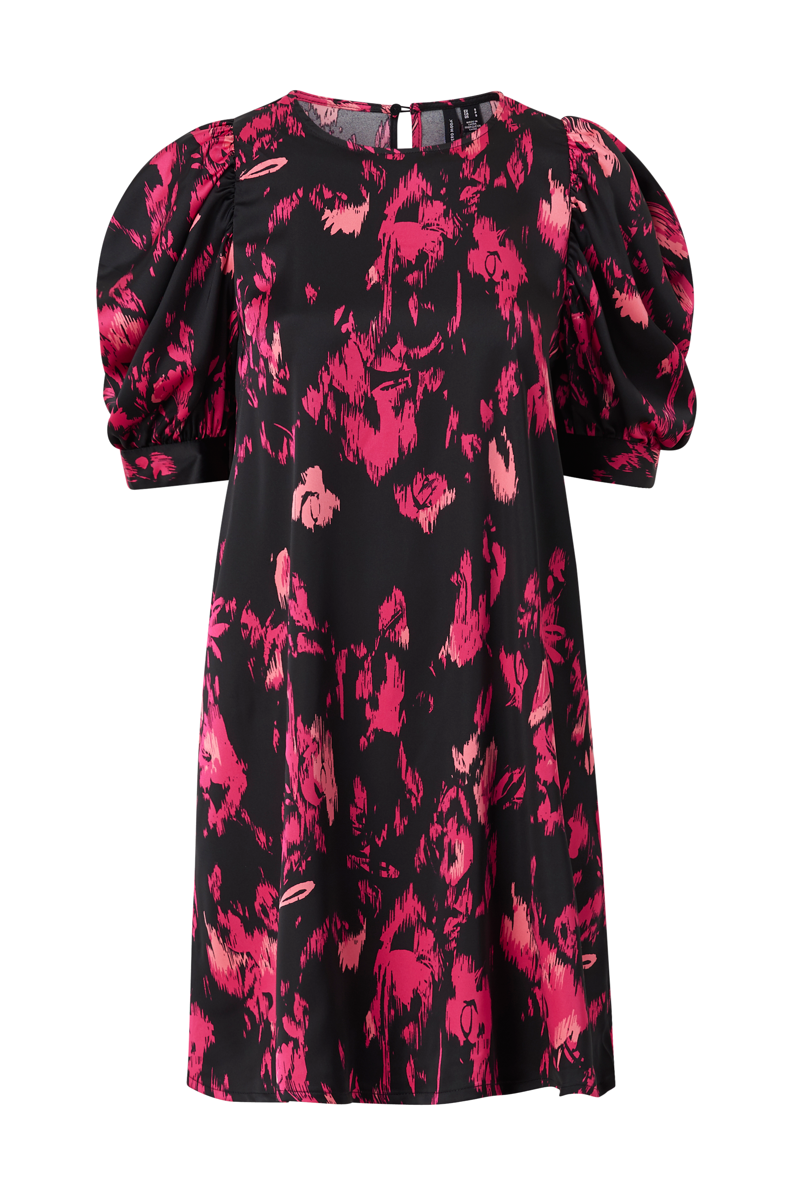 Satiinimekko, jossa voimakkaan värinen kuvio. Kevyesti levenevä malli, puolipitkät puhvihihat ja pyöreä pääntie, jossa halkio ja nappi niskassa. Pituus n. 90 cm koossa S.