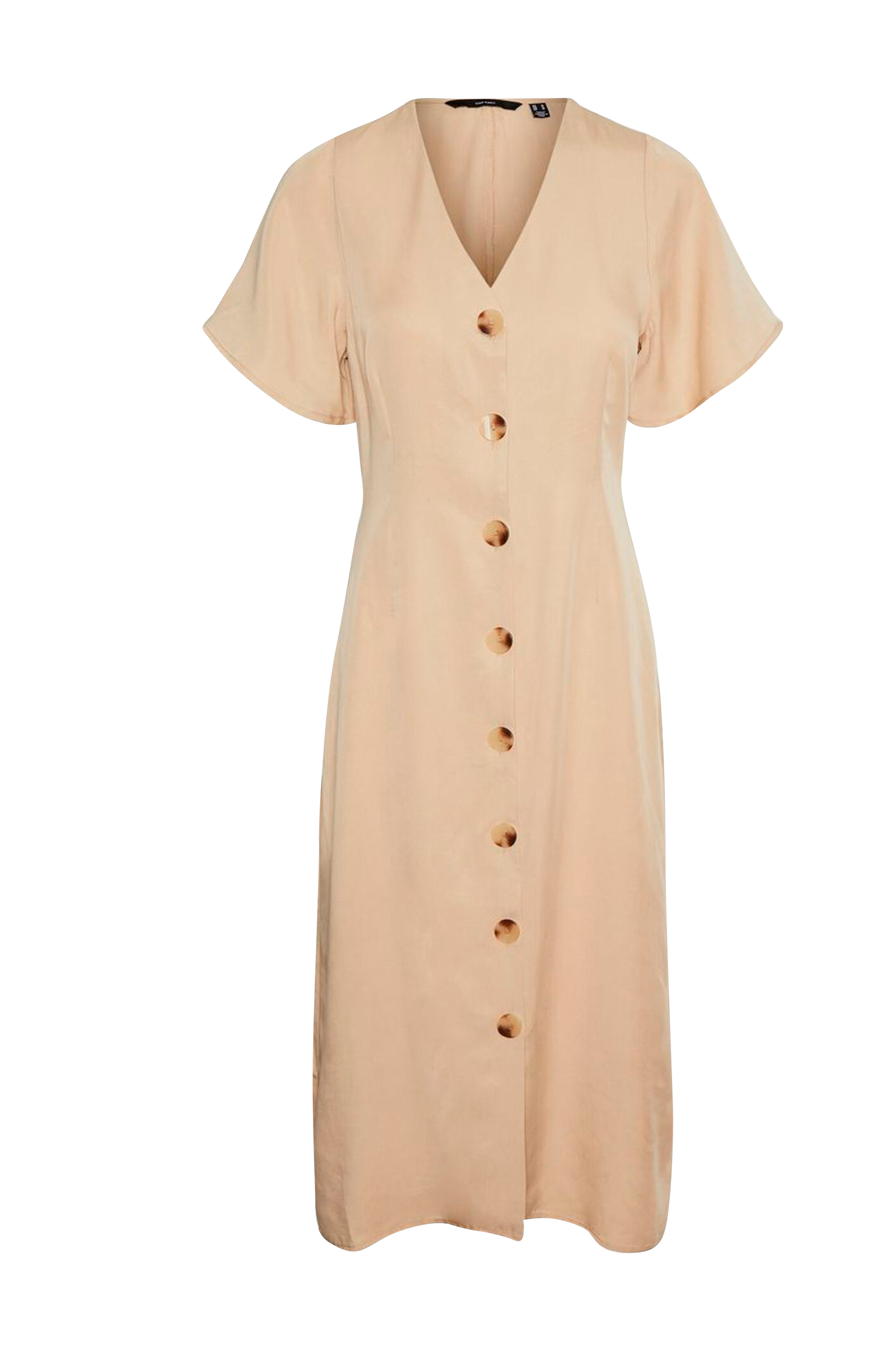 Vartalonmyötäinen malli, jossa edessä V-pääntie ja isot napit helmaan asti. Pituus n. 115 cm koossa S.