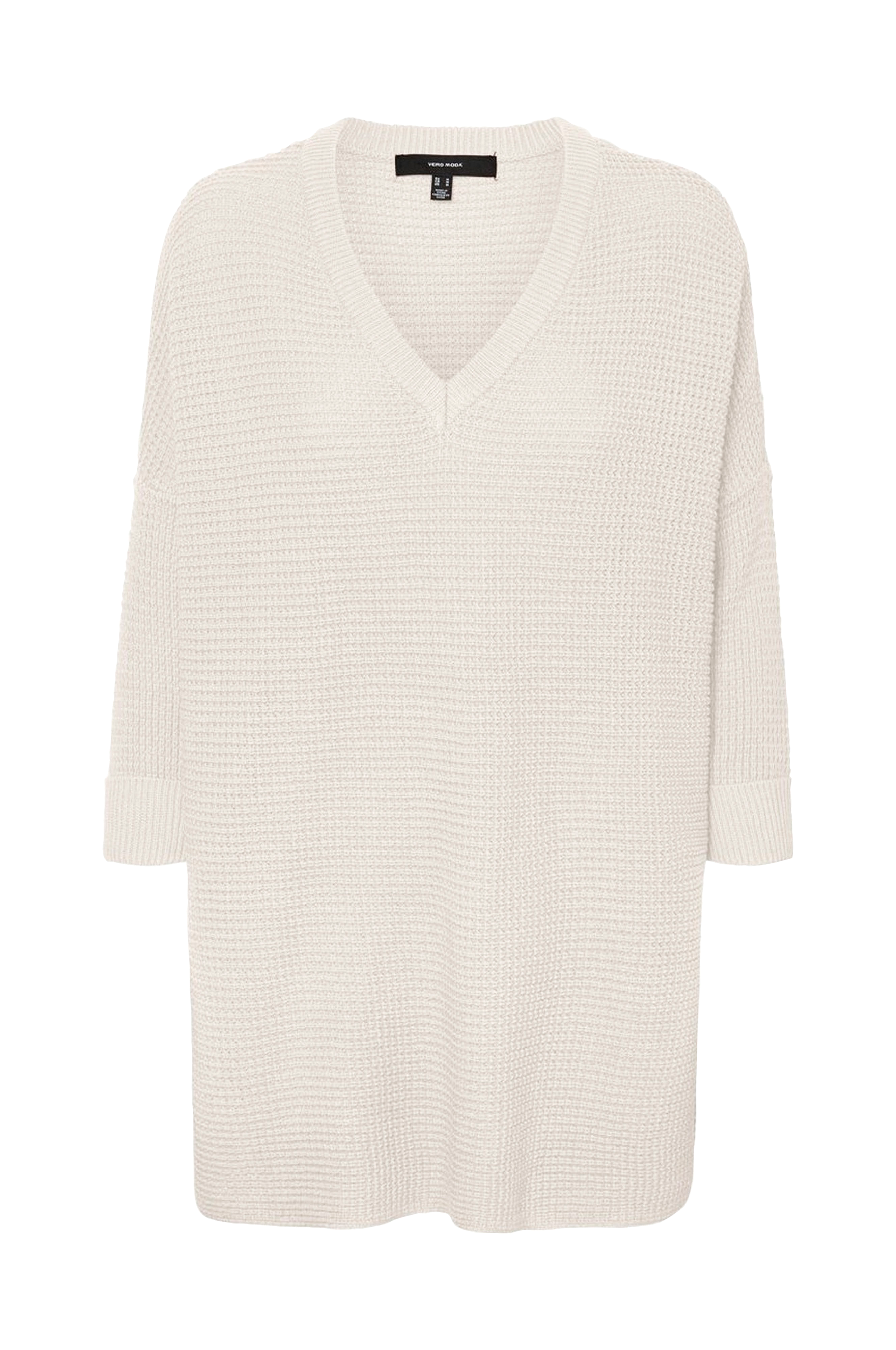 Väljä oversize-mallinen kuvioneulepusero. V-pääntie, jossa joustinneulereunus. Madalletut olkapäät ja 3/4-pituiset hihat, joissa kiinniommeltu käänne hihansuissa.