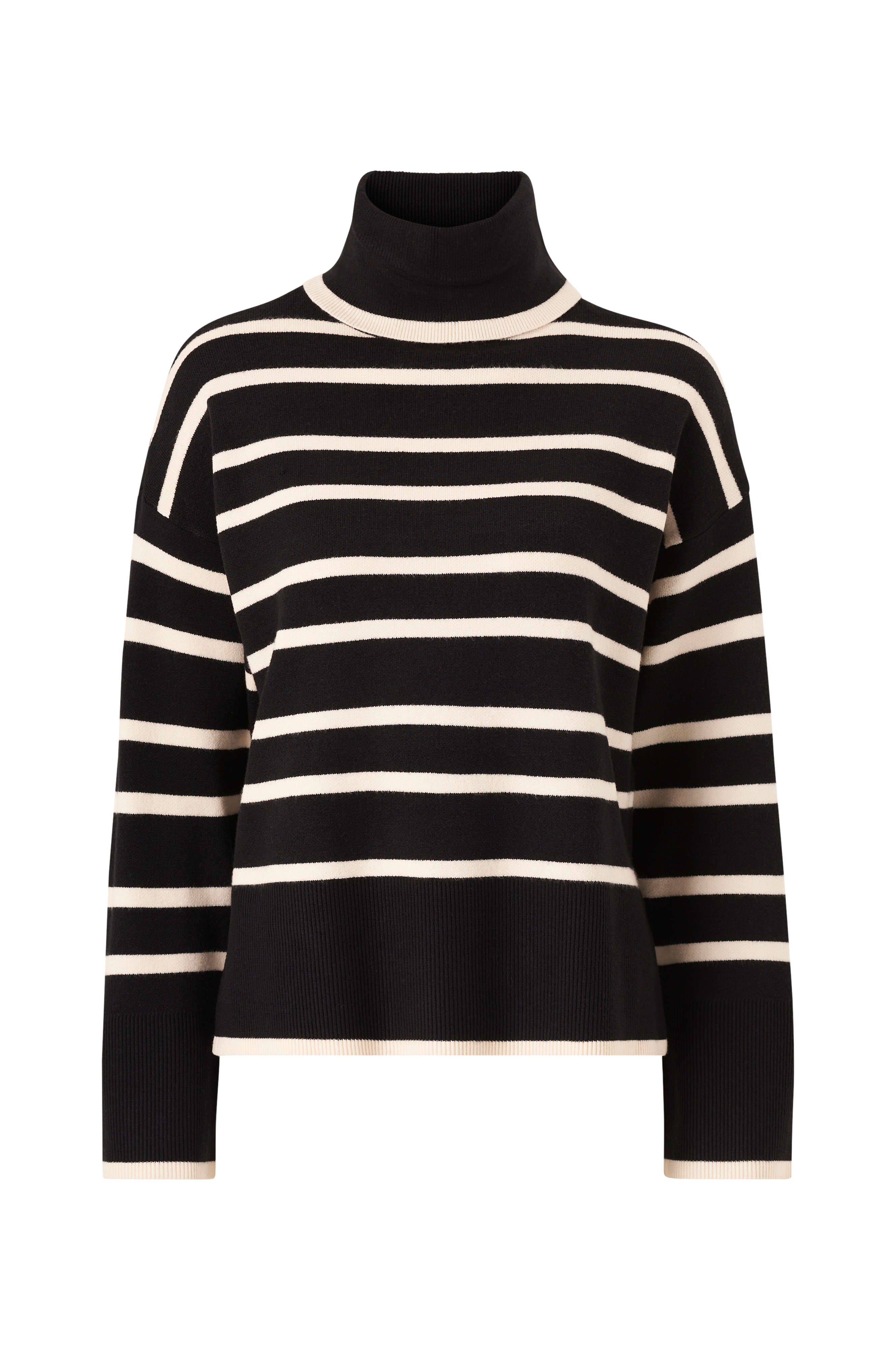 • Suora, rento malli neulotuilla raidoilla• Korkea, resorimainen poolokaulus• Pudotettu olkapää• Suora, leveä hiha ribbineuloksella hihansuissa• Resorimainen helma halkiolla sivuilla