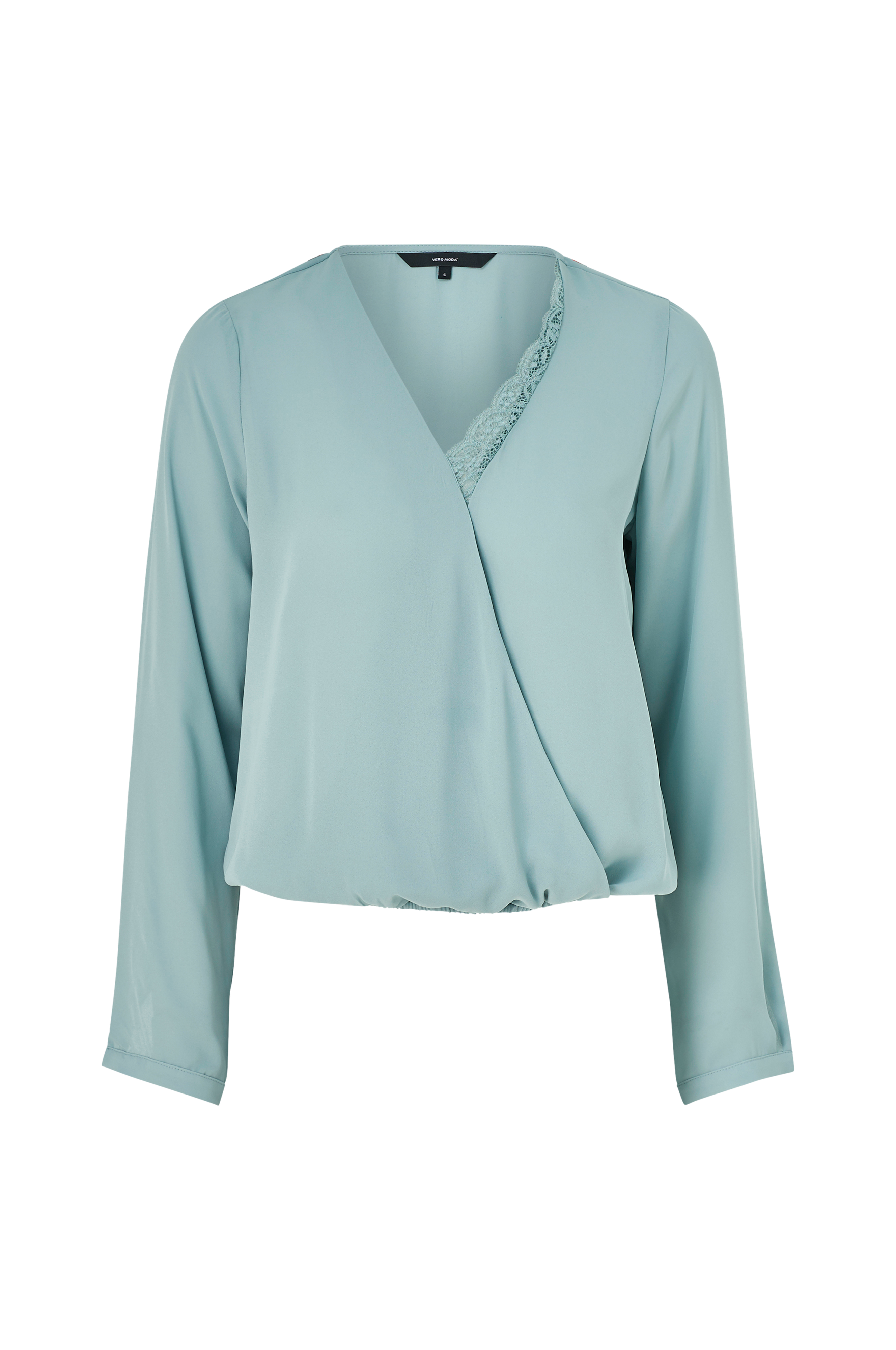 Vero Moda vmScarlet L Wrap Top -paita. Kietaisumalli, joka on ommeltu kiinni pääntien kohdalta. Pitsiä toisella sivulla pääntiessä. Joustava helma ja pitkät hihat, joissa kapea kalvosin ja nappi. Kangasta.