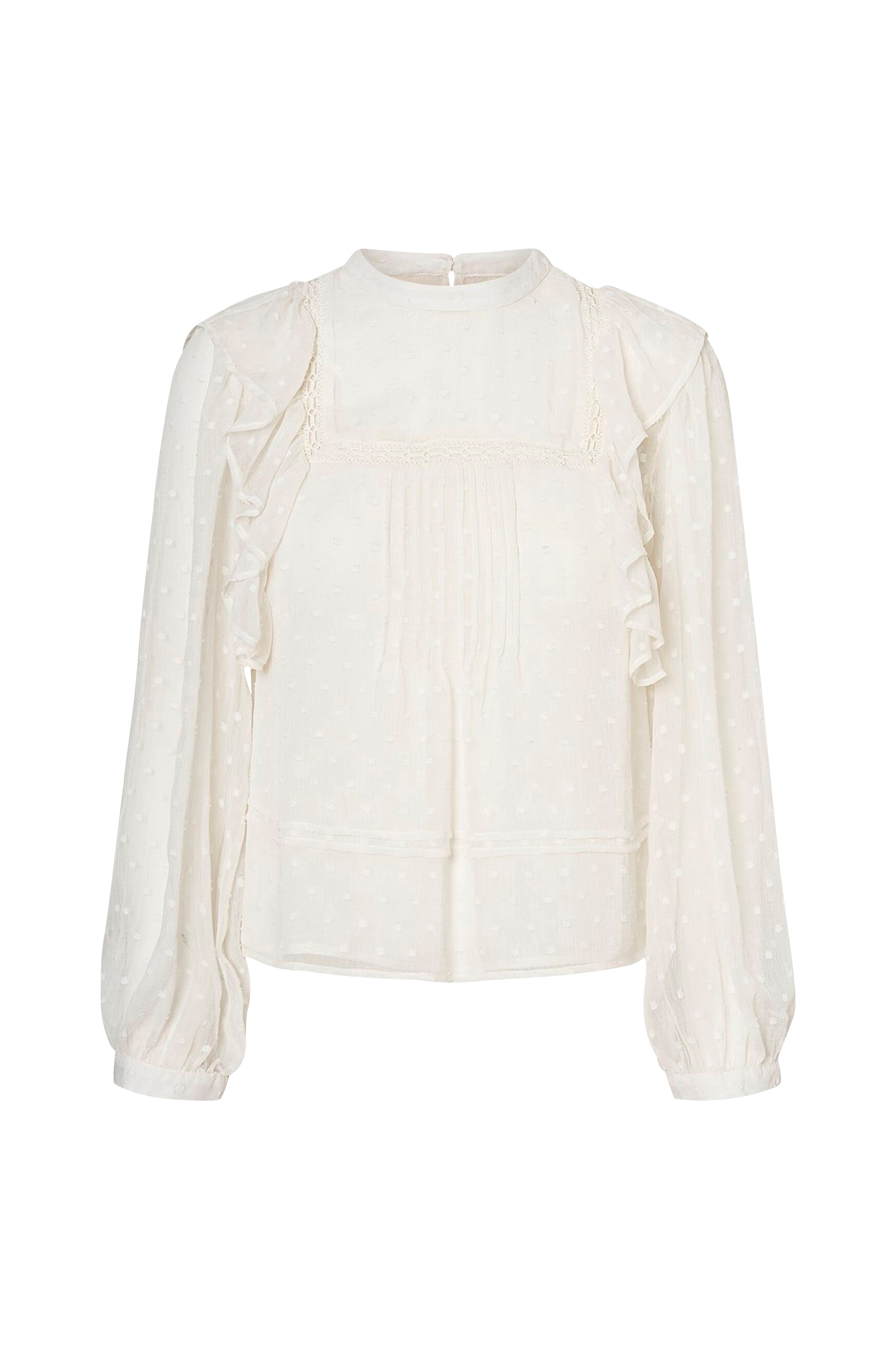 Vero Moda vmWilma L/S Pleat Top -paita. Levenevä malli, jossa upotettu pitsi ylhäällä ja ommellut hiuslaskokset rinnassa. Pyöreä pääntie, jossa päälleommeltu reuna sekä halkio ja napit niskassa. Päälleommeltu röyhelö sivuilla ja yli olkapäiden sekä pitkät leveät hihat, joissa kapea kalvosin. Kohopilkullista sifonkia ja kangasvuori.