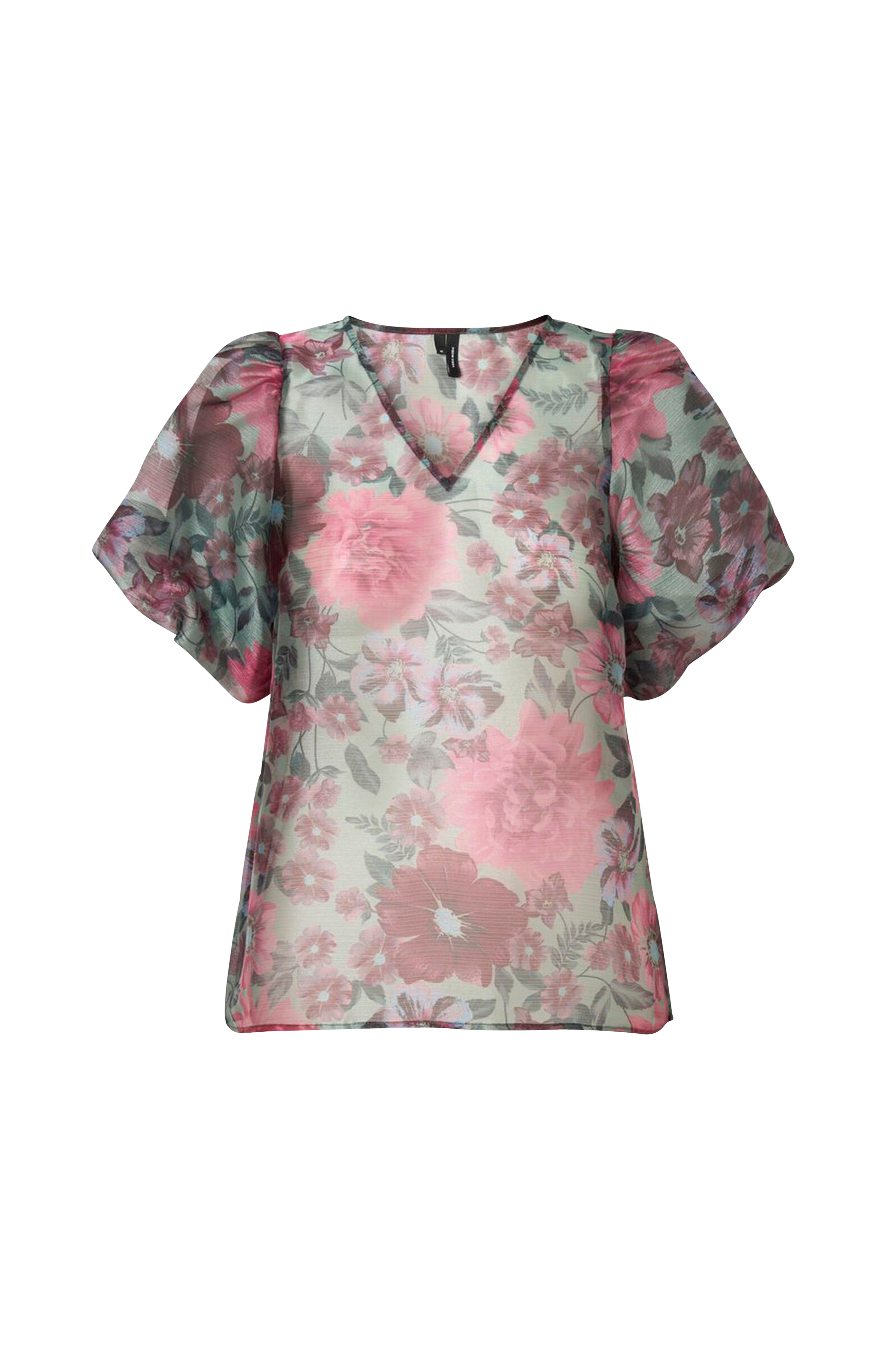 Vero Moda vmAbelia S/S Bubble Hem Top -pusero. Suora malli sifonkia. Lyhyet puhvihihat, joissa poimutukset olkapäillä ja kuminauha hihansuiden sisäpuolella. V-pääntie, jossa kapea päärme.