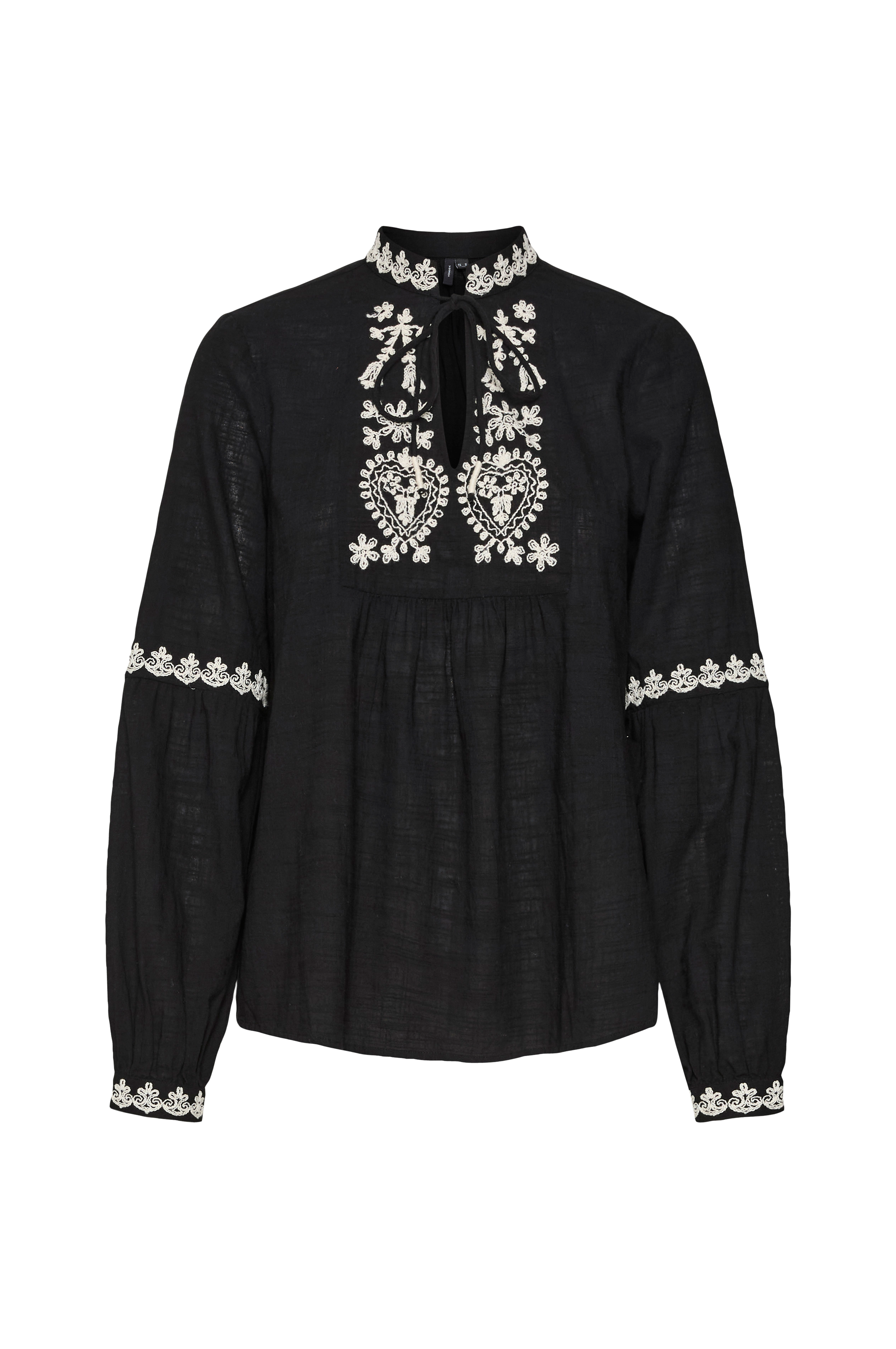 • Suora malli kirjailuilla• Pyöreä pääntie halkiolla ja nyörillä edessä• Pitkä hiha hihansuulla hihansuissa• Rypytys rinnassa