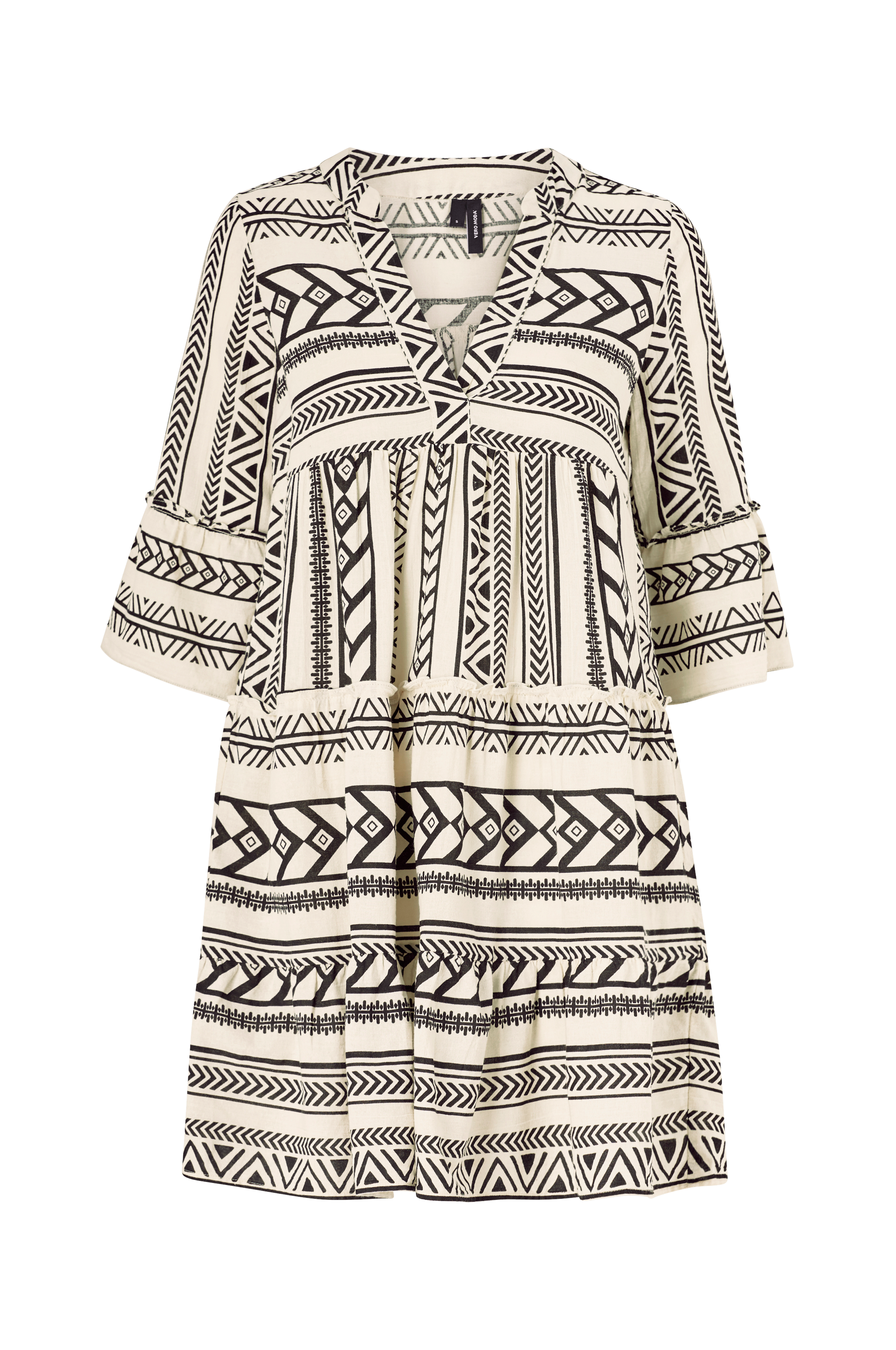 Vero Moda vmDicthe 3/4 Tunic -tunika. Levenevä malli, jossa poikkileikkaus rinnan alla ja leikattu olkakaarroke takana. Päälleommeltu reuna pääntiessä ja v-pääntie edessä sekä leveät, päälleommellut röyhelöt helmassa. 3/4-pituiset hihat, joissa päälle ommeltu röyhelö hihansuissa. Painokuvioista materiaalia. Pituus n. 93 cm koossa S.