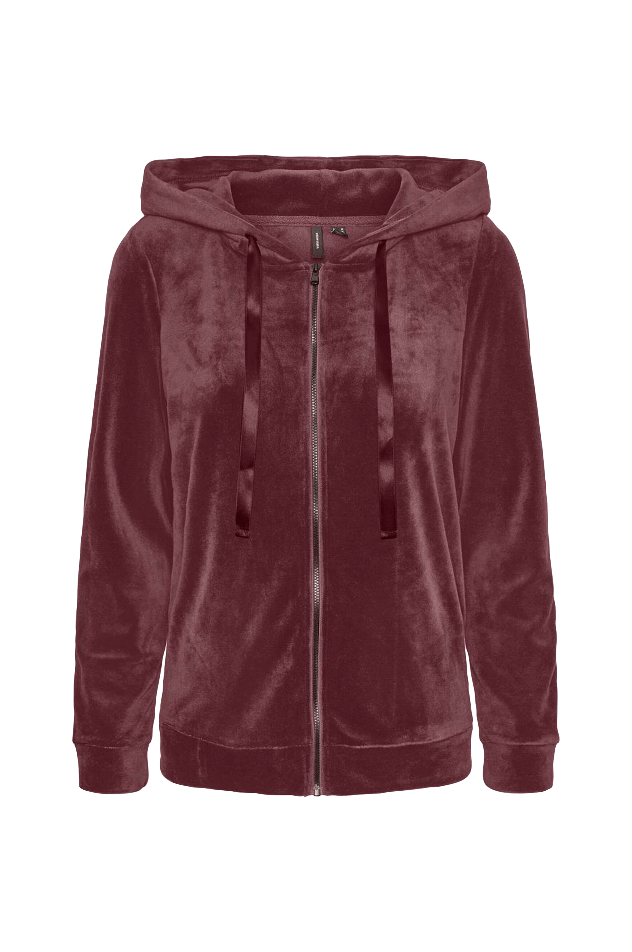 Pehmeä veluuritakki, jossa edessä vetoketju ja hupussa satiininauha. Sivutaskut.