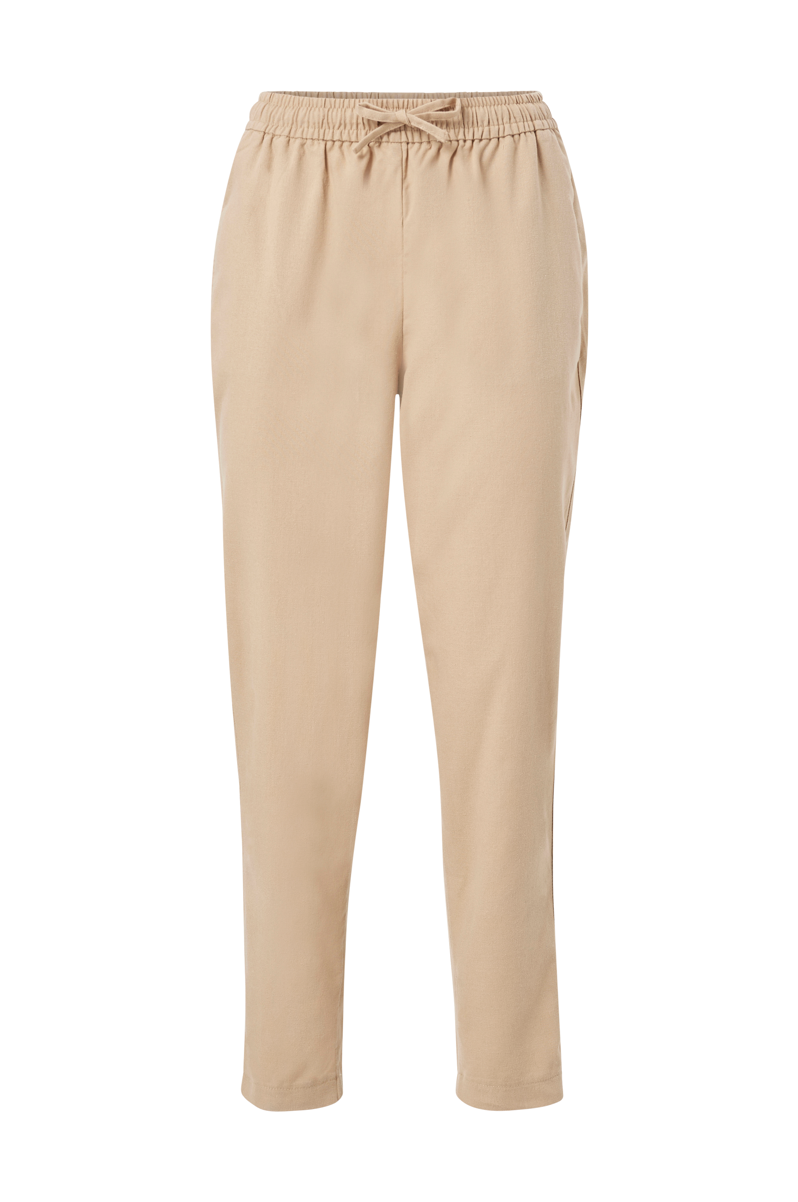 Korkea vyötärö ja päälleommeltu vyötärönauha, jossa upotettu kuminauha ja edessä solmittavat nauhat. Sivusaumoissa upotetut taskut ja takana upotetut valetaskut. Leveät lahkeet ja kapenevat lahkeensuut. Lahkeen sisäpituus n. 66 cm koossa 36.