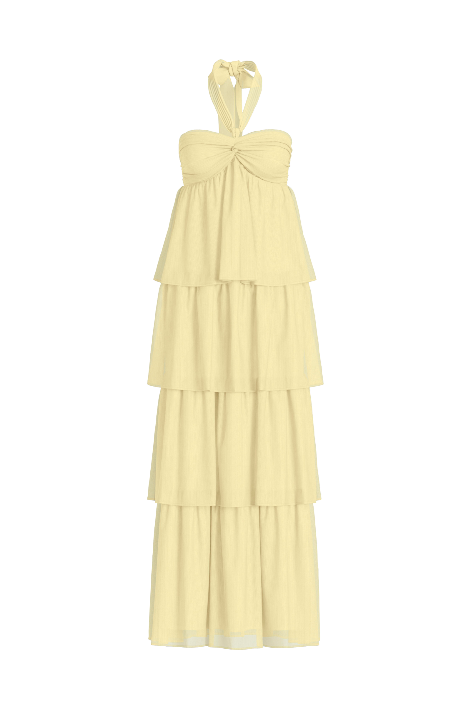 • Pitkä röyhelömekko sifongista• Halterneck-malli sidottavalla hihnalla kaulan ympärillä• Drapeeraus rintamuksessa• Rypytys selässä• Trikoovuori