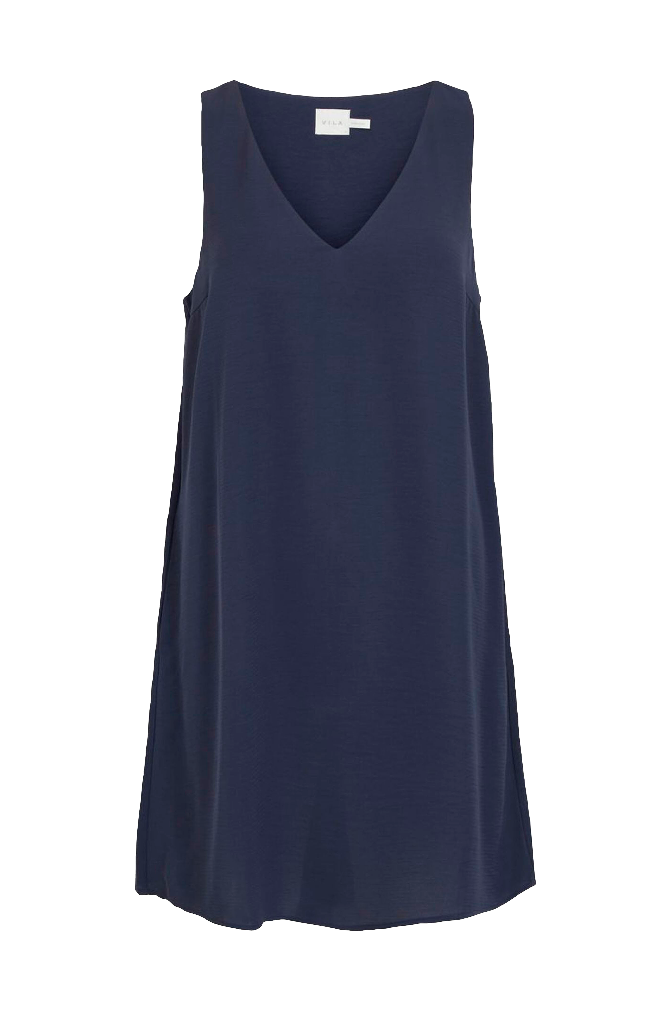 Hihaton mekko, jossa levenevä malli, V-pääntie ja sivusaumoissa upotetut taskut. Pituus n. 89 cm koossa 36.